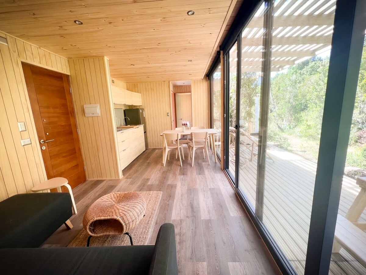 Ulmo es e nuestra cabaña acondicionada especialmente con accesibilidad universal, un apartamento de 35 metros cuadrados inserto en el bosque siempre verde del sur de Chile. Nuestras cuatro cabañas comparten una única y amplia tinaja de madera calefaccionada a gas que esta a disposición de los huéspedes durante su estadía, se agenda una hora de cortesía sin costo, consulte con los anfitriones disponibilidad y valor de horarios adicionales que se cancelan vía transferencia.