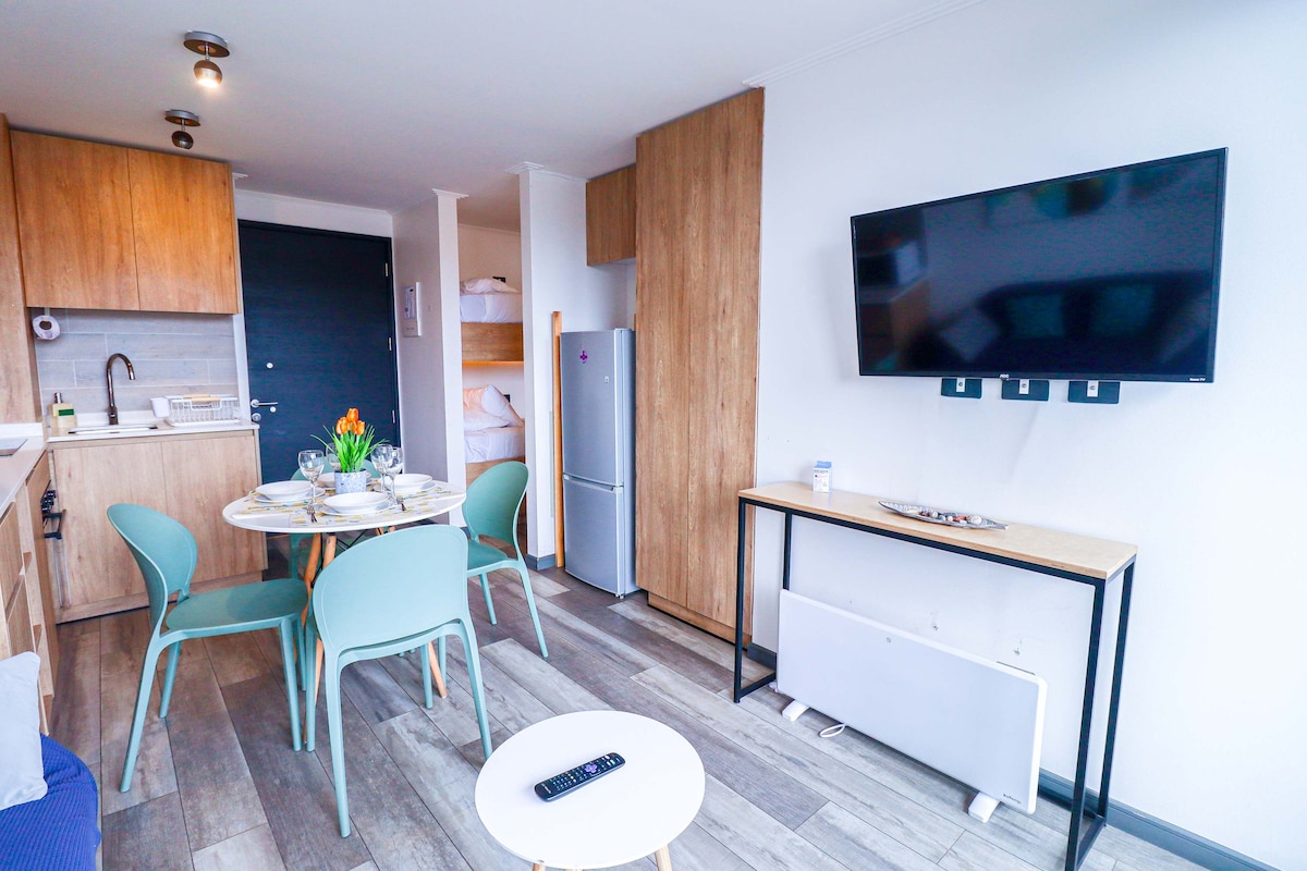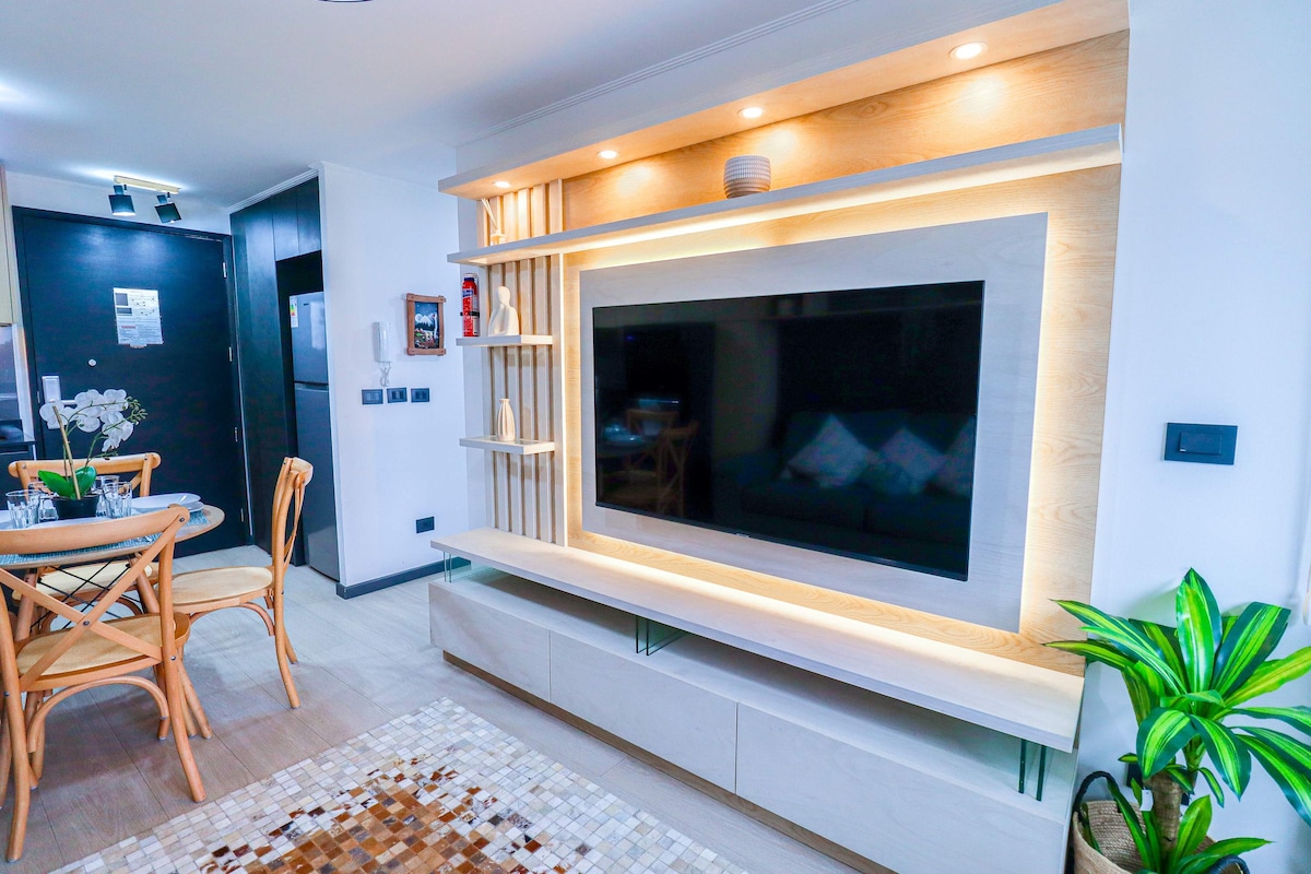 Espectacular departamento, estacionamiento techado y piscina temperada en el edificio. Ubicado cerca a la costanera, este departamento cuenta con sábanas y toallas incluidas y una cocina completamente equipada con refrigerador panelable, cocina encimera eléctrica, campana de extracción, microondas, horno eléctrico. El cómodo sofá y la Smart tv en el living.
