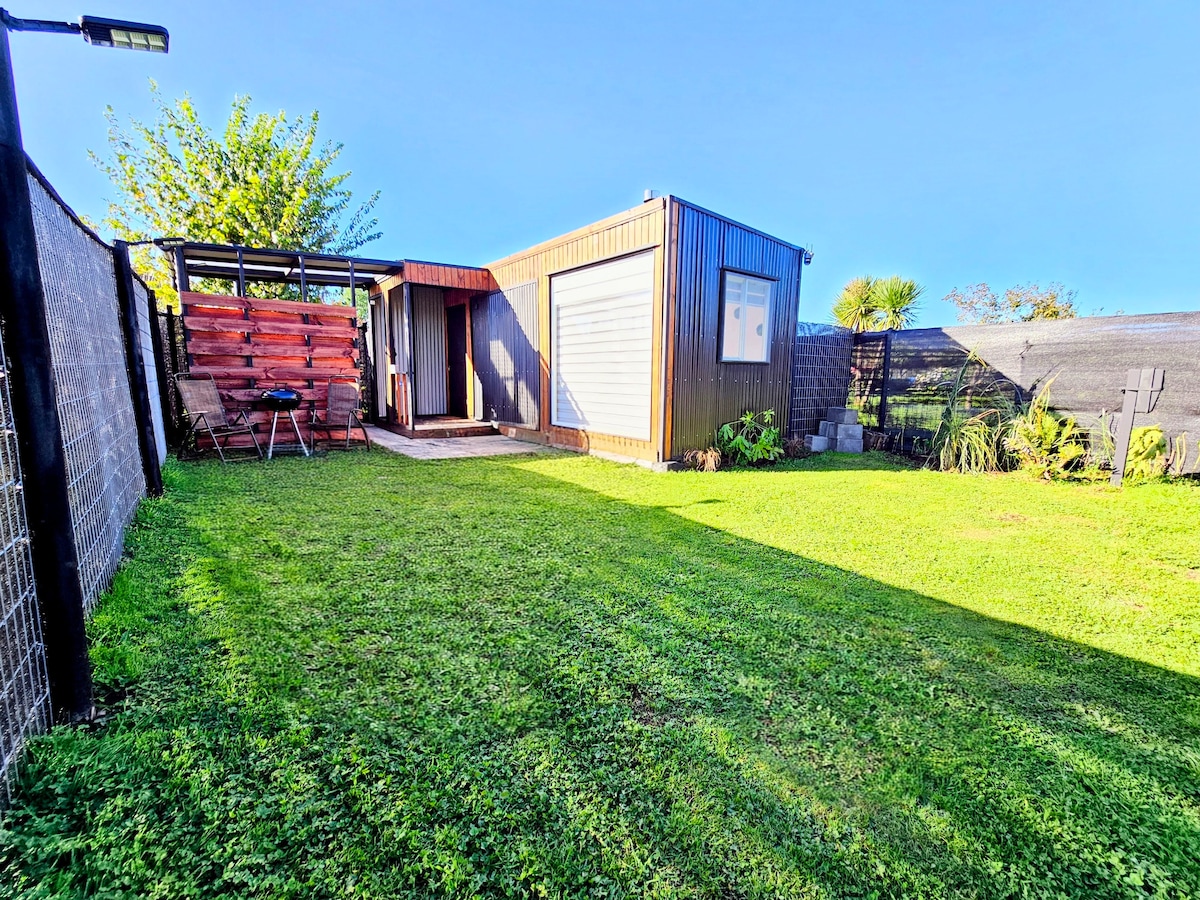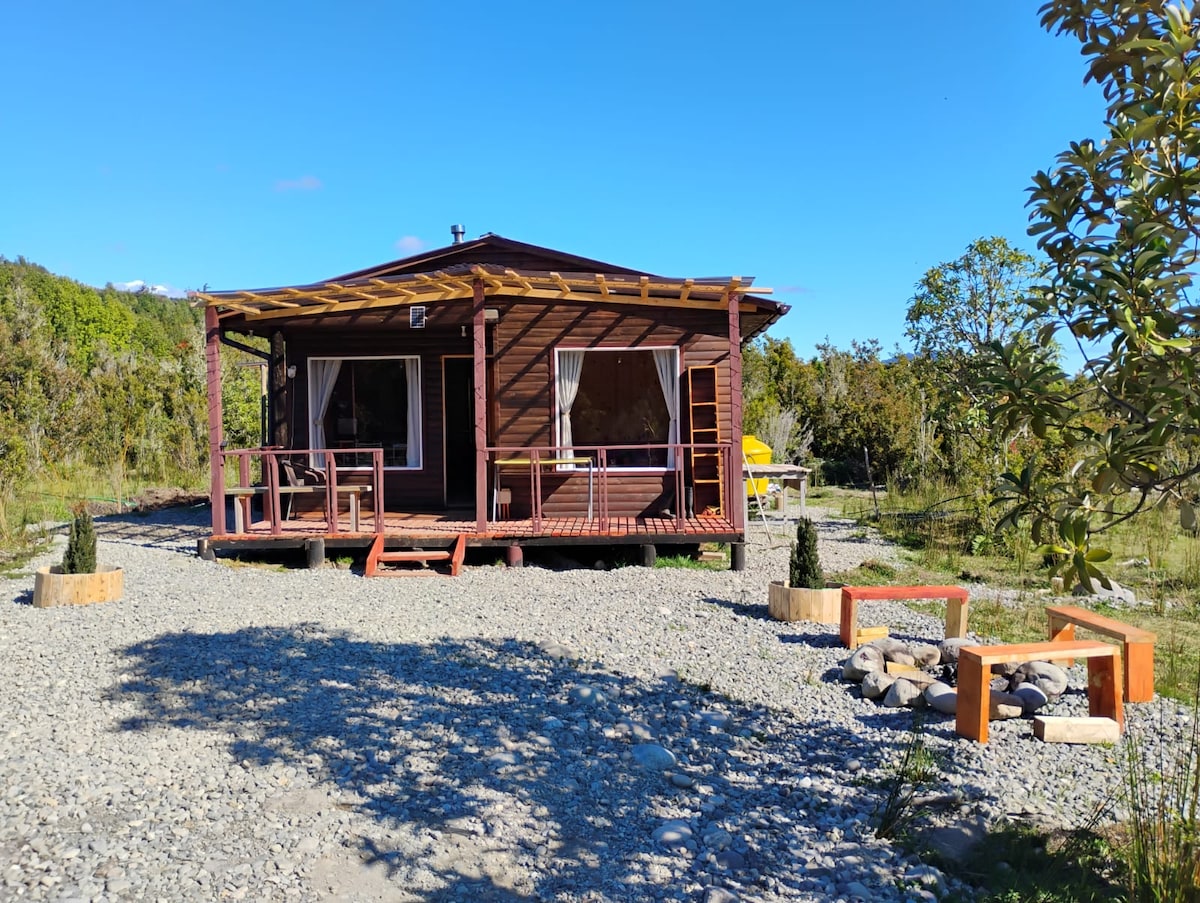Es una cabaña rústica tipo Tiny house(cabaña pequeña) sustentable para 2 personas. MUY IMPORTANTE :No tiene tv, cuenta con un pequeño frigobar, secador de pelos, cuenta con cocina a leña y aire acondicionado frío calor. Cuenta con una tina caliente tiene costo extra de $40.000 pesos. Rodeada de árboles nativos fué construida tratando de mantener el equilibrio con el alrededor. Hay un fogón al aire libre. A 1 kilómetro y medio está el pueblo de Río Puelo y a 3 kilómetros de las Termas del Sol