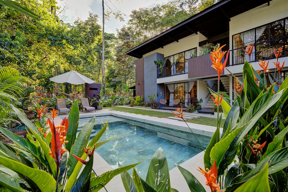 Spacious, new, modern and comfortable unit with private entrance and AC in every room. Big pool. Outdoor and Indoor shower with hot water. Full kitchen. Only a 5-minute bike ride through the jungle to the beach. Outdoor patio. Enjoy modern conveniences in the middle of a jungle paradise. Sleep to the soothing cacophony of frogs and cicadas, and wake up to the energy of toucans and monkeys. a hot indoor shower, an outdoor shower, a gas stovetop range, screens on every window, and more.
