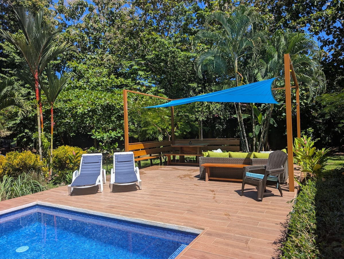 Located in the rainforest. Less than 10 minutes drive to the nearest beach, grocery store and dining. 2 bikes included in the rental. The apartment is screened-in. But, you can slide open the screen if you like. Included are bed linens, towels, toilet tissue, soap. Hot water in the kitchen and the shower. Hear the Howler monkeys. See the birds, sloth, geckos and all the sights and sounds of being in the rainforest. Not suitable for children under 12. No pets. Enjoy your journey!! :-D
