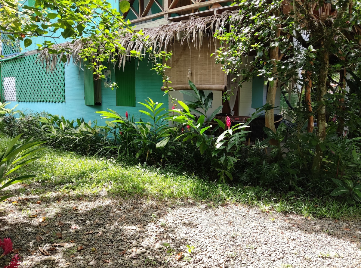 COMFORTABLE HOME IN RAINFOREST GARDEN Fully equipped 2-bedroom house in wonderful tropical setting. Enjoy nature & spot wildlife at Casa Lirio. Walking distance from gorgeous beaches (1.5km), 5 min drive to lively Puerto Viejo & 20 min to Cahuita National Park. Fiber optic wifi, airco, fully fitted kitchen with all basics & 18L bottled water. AC. Breakfast US$15 pp per day, paid laundry service. The house is on the outskirts of the property, so there is some street noise.