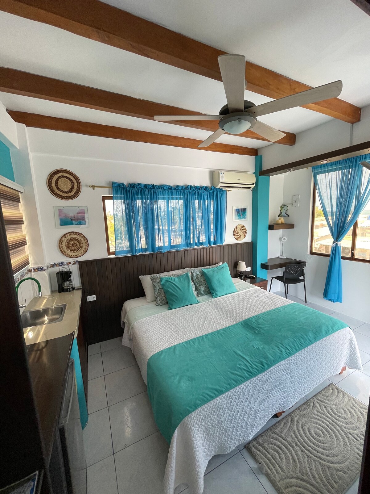 A 200 metros de la extensa playa de Puerto Villamil. A 5 minutos caminando esta la Iglesia Católica de la isla, parque central y restaurantes. Apartamento con cama matrimonial, cocina y sala de estar privado ideal para pareja o una persona que disfrute de su espacio como en casa, a pocos metros de las extensas playas y al frente de la poza de flamingos (animal endémico de Galápagos). Además tiene internet starlink y acceso compartido a patio frontal y área de lavandería con tendedero.