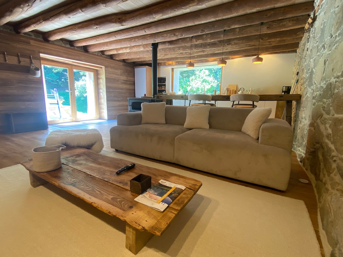 Venez profiter d'une expérience ressourçante au sein de la Grange du Père Émile, nouveau chalet de village, dernière née des Granges Deth Pouey. Vue absolument panoramique de toutes les pièces et du jardin clos, ainsi que du sauna et de la douche extérieure. Dépendance sécurisée pour les vélos et skis. Clim dans toutes les pièces. 2 chambres avec chacune sa sdb. Logement spacieux pour 4 personnes. Lit de camp d'aventurier pour un enfant (5p). Chargeur V.Elec. Prestations de très belle qualité.