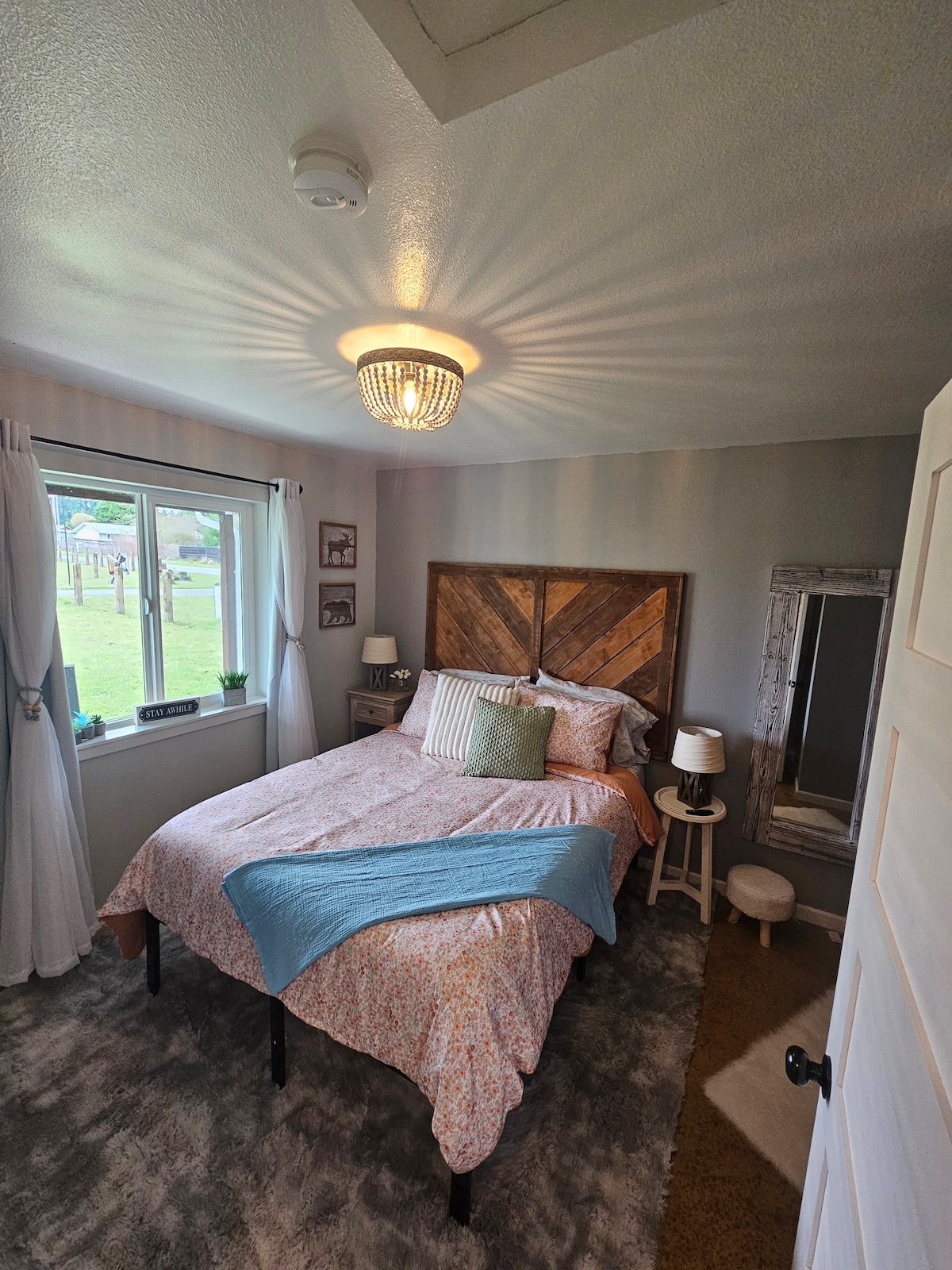 On a quaint country road with views of the Olympic mountains to the south and the Salish sea to the north you will find a 5 acre sheep farm that we call (with a nod to the Scottish tradition) the Crofts. Our Katmoget Croft is light and airy with high ceilings, quirky decor and windows on all sides that frame the pastoral surroundings. It features a well-appointed kitchen with bar seating, comfortable queen bed, flat screen tv, starlink internet, and large patio/outdoor living area.