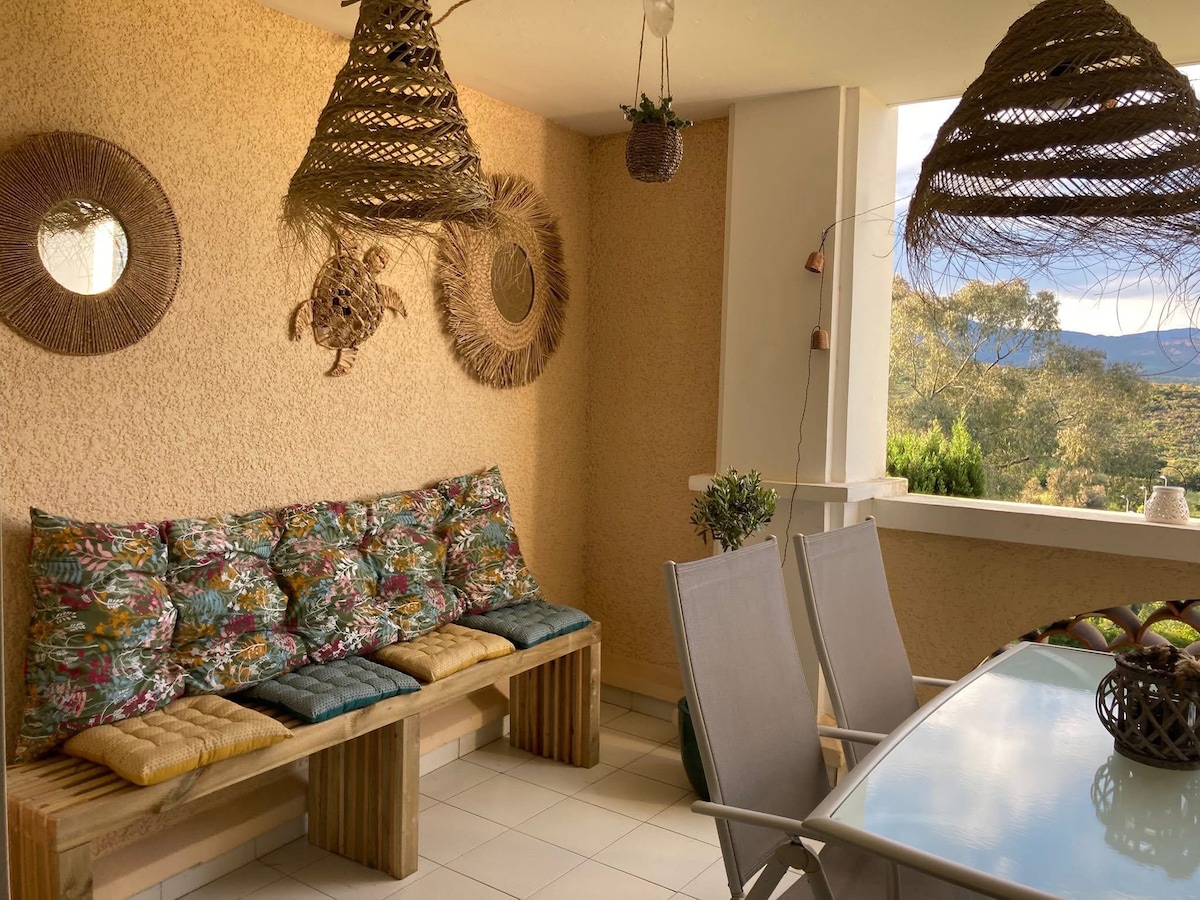 Pour des vacances exceptionnelles dans un appartement rénové; l'environnement unique au sommet d'un domaine privé, sans voisinage direct et avec une vue mer fantastique. Chambre double, salon, coin repas, cuisine et des terrasses, une face au jardin, une face à la mer. Accès à la piscine (Chauffage sur demande, pris en charge des frais), les serviettes et le linge de lit sont fournis. Buanderie, machine à laver et sèche-linge. Plage La Nartelle 8 min. en voiture, center ville 10 min. en voiture