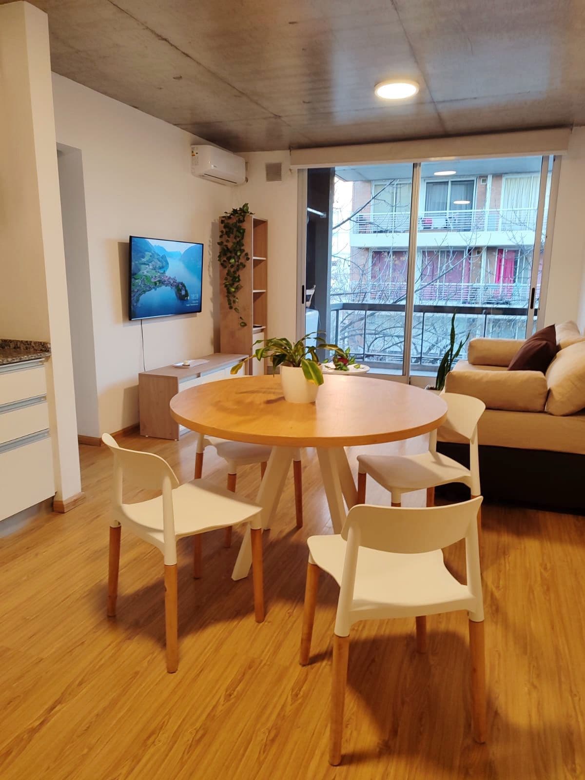 Cálido y luminoso departamento completamente equipado. Ubicado en zona norte, a una cuadra del Bv. Rondeau. Muy cerca del Shopping Portal Rosario. En las inmediaciones podrá encontrar todo lo necesario para una estadia agradable, restaurantes, supermercado y locales comerciales. Además, cuenta con estacionamiento cubierto incluido en la tarifa. IMPORTANTE: El departamento se encuenta en un segundo piso, solo acceso por escaleras. La cama queen mide 1,45 de ancho. Estaremos felices de recibirlos.