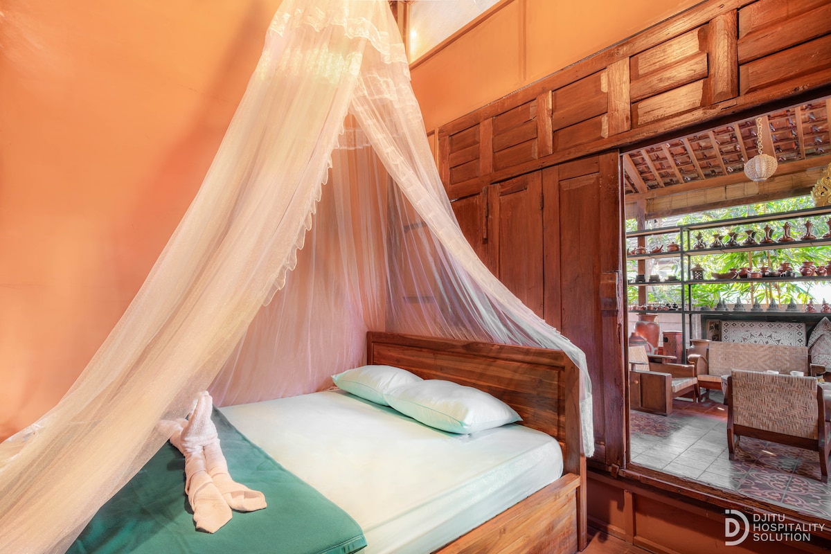 Immerse yourself in the elegance of traditional Indonesian design. Our double occupancy room showcases a beautiful blend of antique wooden elements and rustic textures, featuring a spacious bed with a romantic mosquito net canopy. The room offers direct visual access to our charming lounge area, decorated with exquisite local pottery.