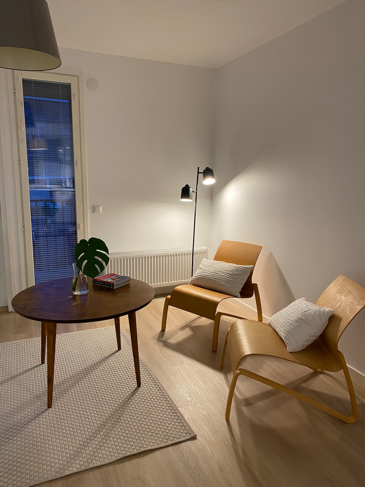 The beautifully renovated one bedroom apartment will serve you during your stay. The apartment has a sauna and a washing machine. The kitchen has just been renovated and is equipped with with modern equipment. The bedroom has twin beds and the living room has a double sofa bed. If necessary, a bed for a baby is also provided. The apartment has a beautiful décor and large windows to the evening sun. Welcome!