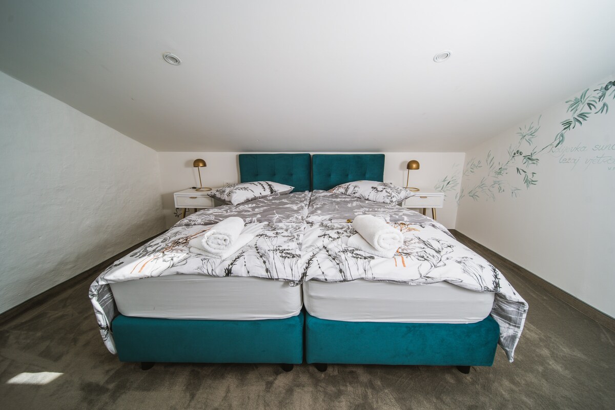 The apartment is a beautiful spacious space with a light airy bedroom, a completely functional kitchen and a spa bathroom. The bedroom has a view of the Mirna valley, a double bed, a sofa that can be made into an extra bed (upon request), a flat TV, a coffee table with two chairs and a big wardrobe. The kitchen if fully functional with all the appliances and dishes. Kitchen towels, dish detergent and sponges are included. The bathroom has a spa shower and a jacuzzi bath for two.