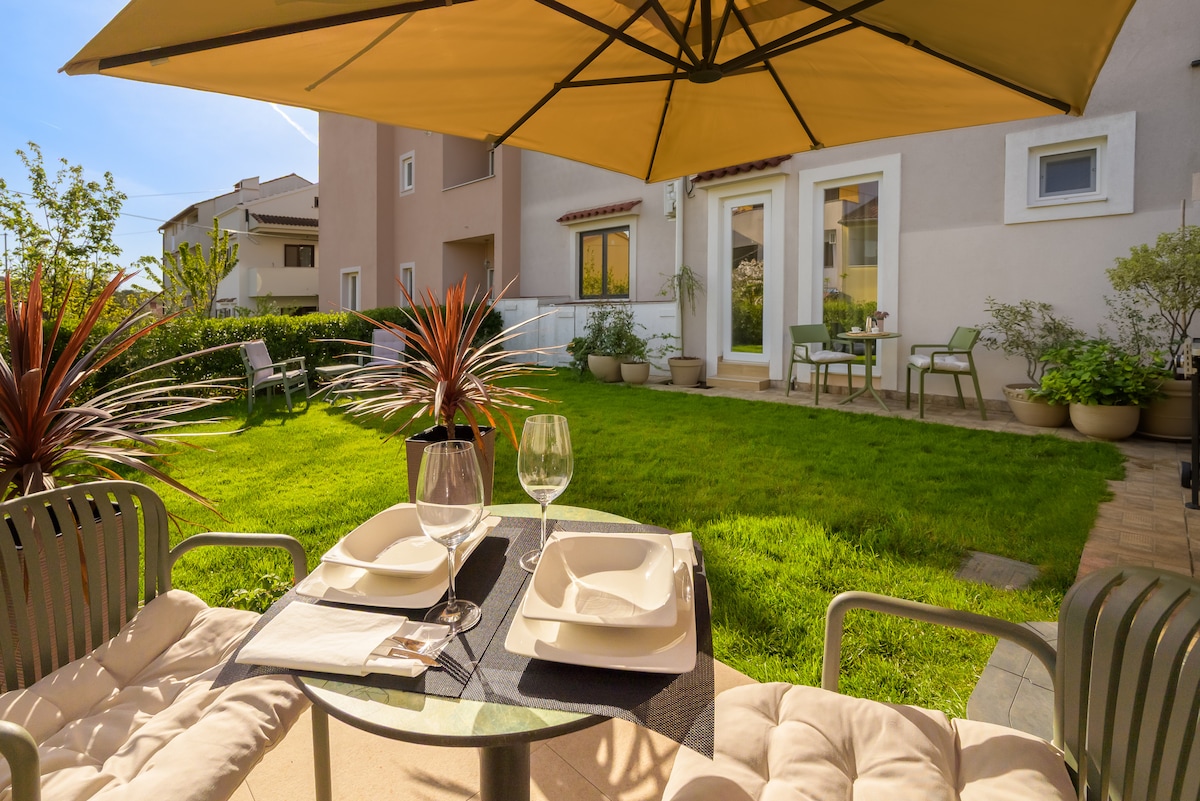 Apartman se nalazi u prizemlju obiteljske kuće i iznajmljuje se isključivo kao jedini apartman. Apartman je nov, potpuno opremljen. Svaki detalj u apartmanu uređen je pažljivo i sa puno ljubavi, da bi vam pružio maksimalnu udobnost i omogućio uživanje u vašem godišnjem odmoru. U sklopu apartmana imate prekrasnu zelenu terasu, koja vam pruža privatnost i mir, te besplatan parking, privilegija u centru. Sve znamenitosti grada Pule možete obići laganom šetnjicom, bez potrebe korištenja automobila