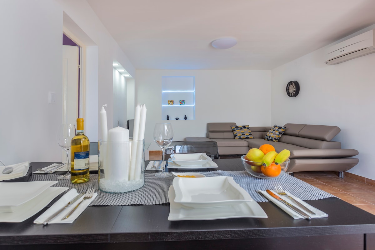 Feel the spirit of nobility in an apartment within a historical Austro-Hungarian villa. It's a modern, air-conditioned space with a cozy feel courtesy of parquet floors and cheerful artwork. Share a bottle of wine on a terrace overlooking old pines. We were paying attention on every detail to make a place that feels like home. Our wish is that every guest have wonderfull holiday and go home with nice Apartment is located in historical villa, surrounded with big trees of cedar and pine. .