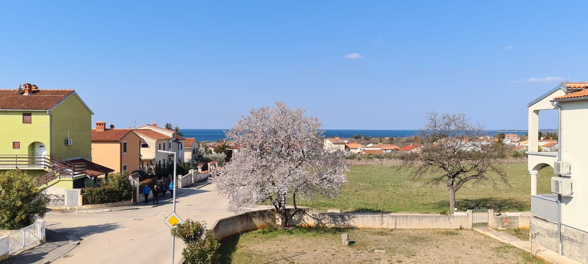 moderno potpuno opremljeni apartman sa lijepim pogledom na more i kvarnerske otoke, smiješten na prvom katu i zasebnim ulazom sa velikom terasom od 60 Ovaj se apartman nalazi u obiteljskoj kući i ima pogled na more.Udaljen je 800 m od šljunčane plaže, i 400 m od centra . Smještajna jedinica ima potpuno opremljenu kuhinju, SAT i besplatni Wi fi,apartman je aklimatiziran ali se korištenje klime plaća naknada po satu 1 € po korištenju (climacard)Besplatni parking u blizini ili na ulici.