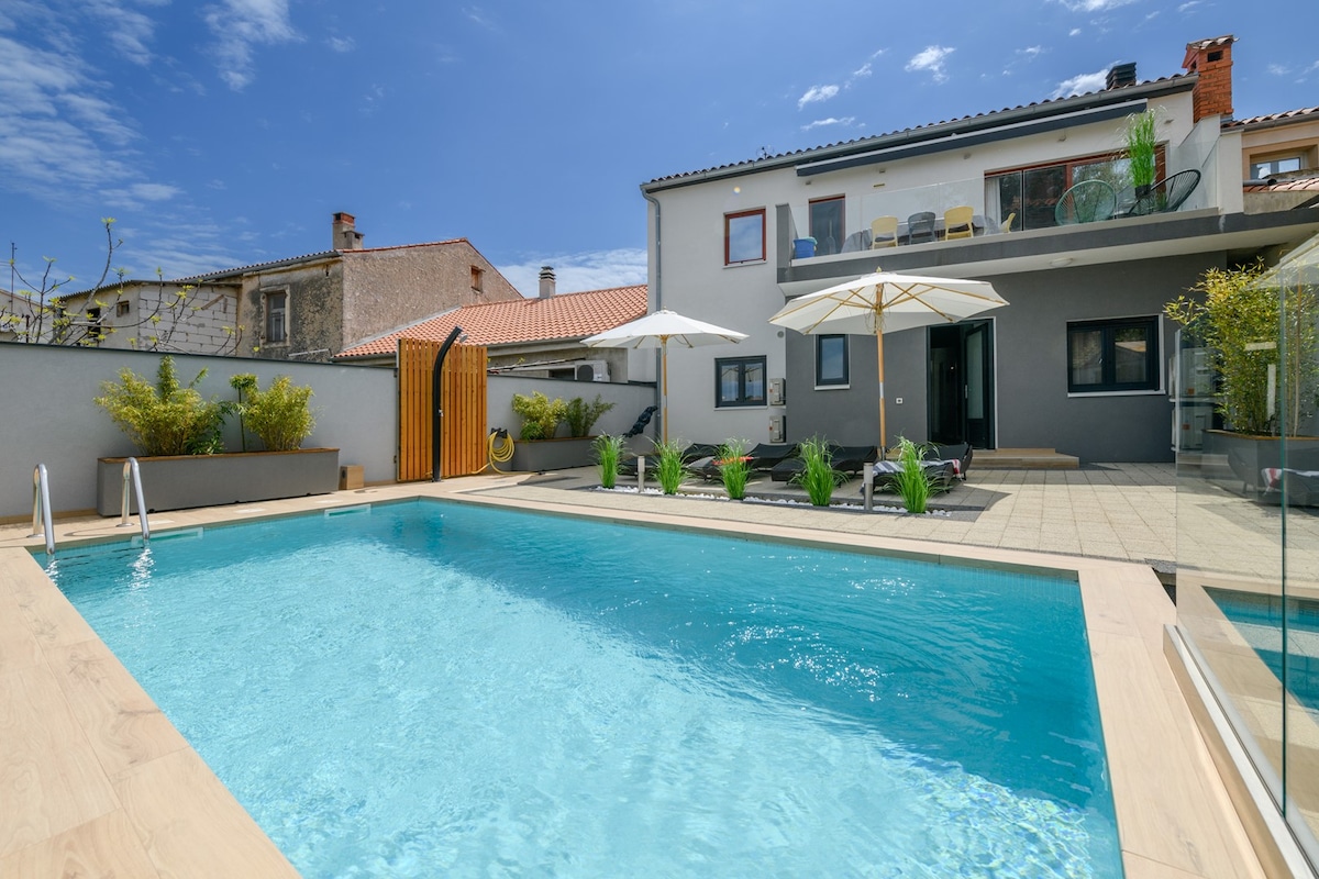 Villa del Sol near Fažana is a modern and stylish retreat located in Valbandon, 3.5 km from Fažana and 8.5 km from Pula — an ideal base for exploring Istria. The villa hosts up to 8 guests, with 3 bedrooms, 4 bathrooms, and 1 separate toilet. Outside, the private pool is the centerpiece, surrounded by sun loungers. A covered BBQ area with outdoor dining creates the perfect setting for enjoying evening meals. For added convenience, there are three private parking spaces.