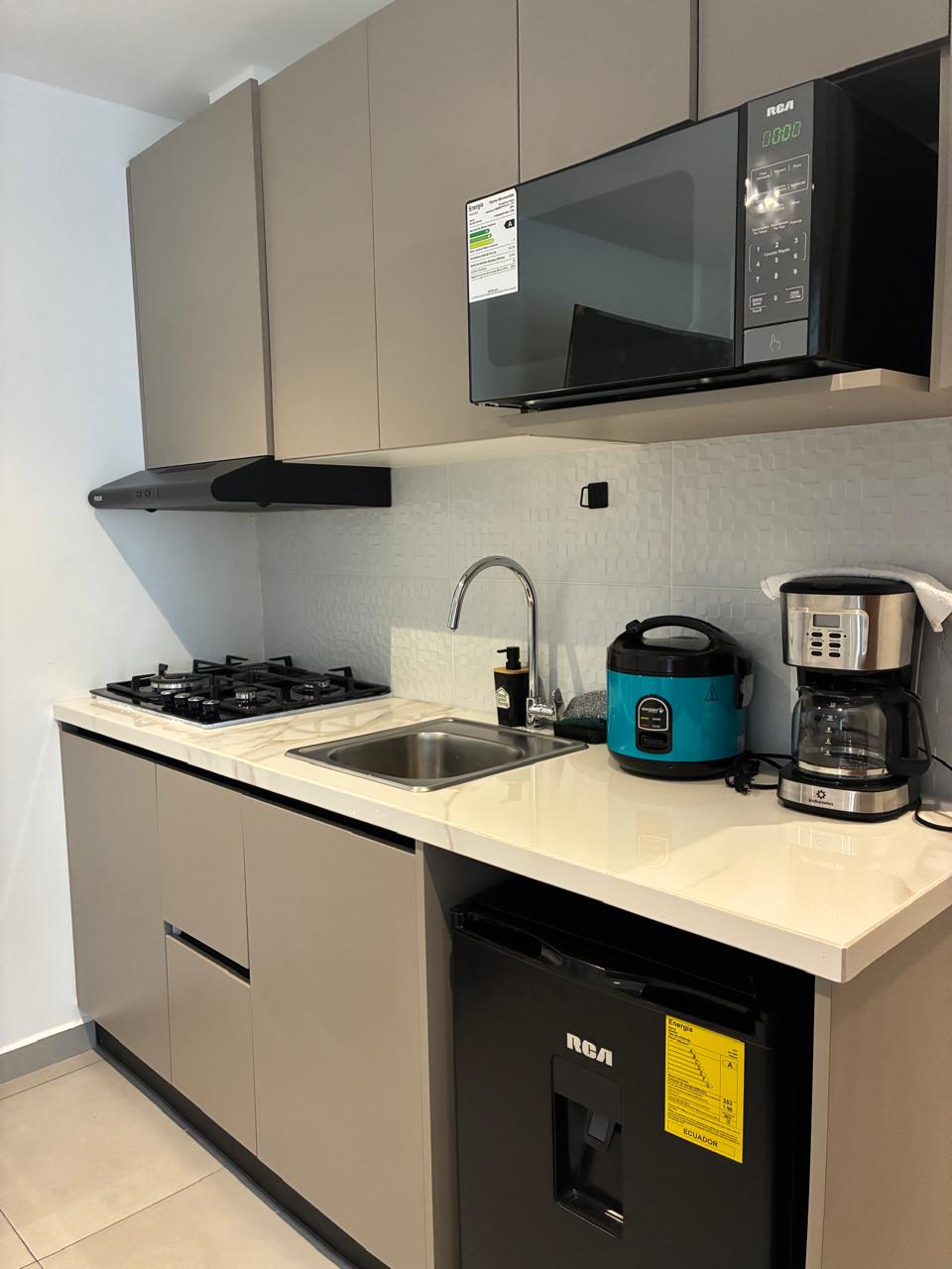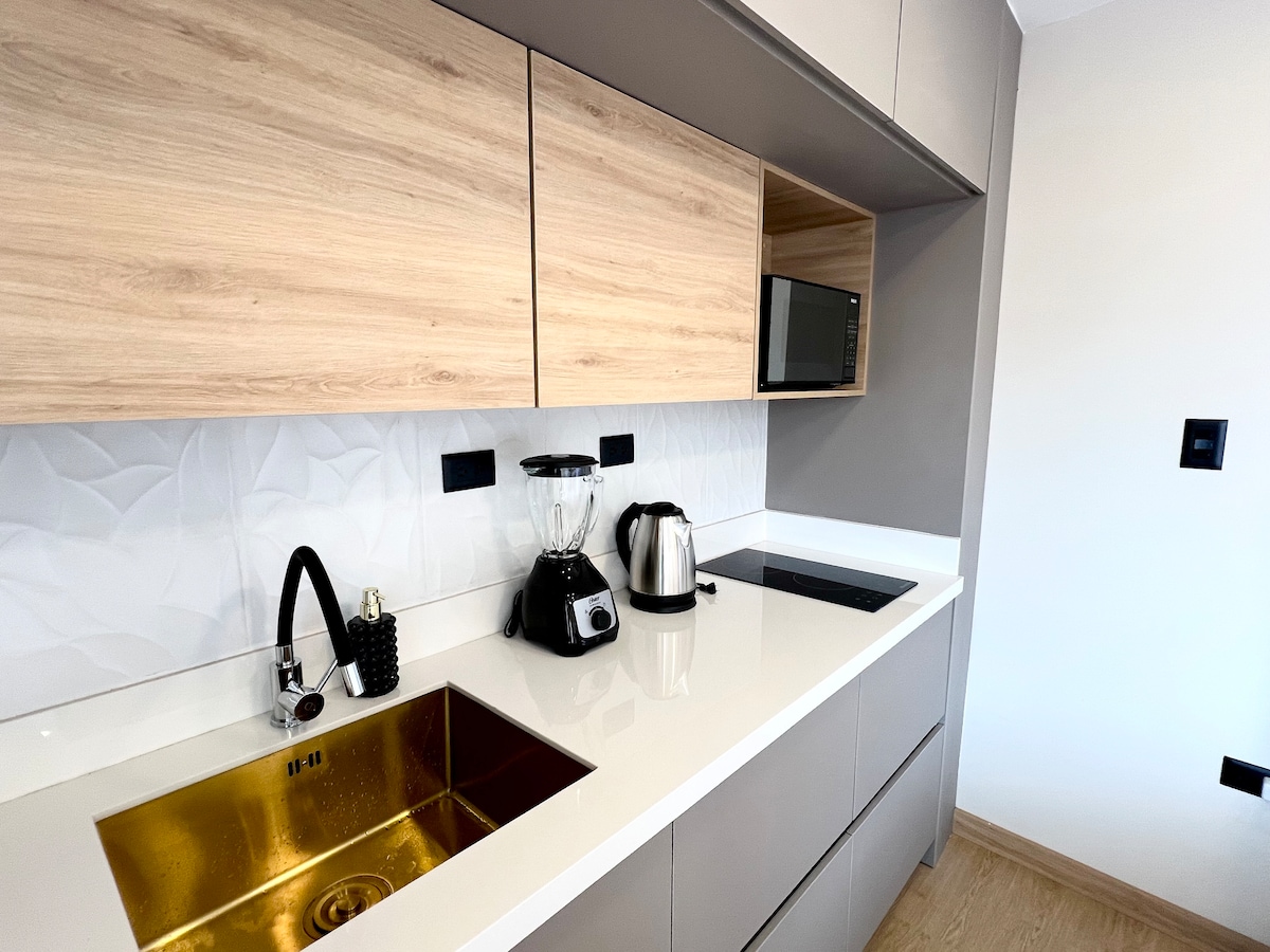A spectacular brand new Suite located in the best neighborhood of Cuenca "El Vergel". The suite has a Queen size bedroom, 1 full luxury bathroom, spacious equipped kitchen and also a work area equipped with the best internet speed. The surroundings of the suite are incredible, river, parks, gastronomic area, bakery, stadium, city center, historic center, university, Clinics, College, Banks all within a radius of 500 meters.