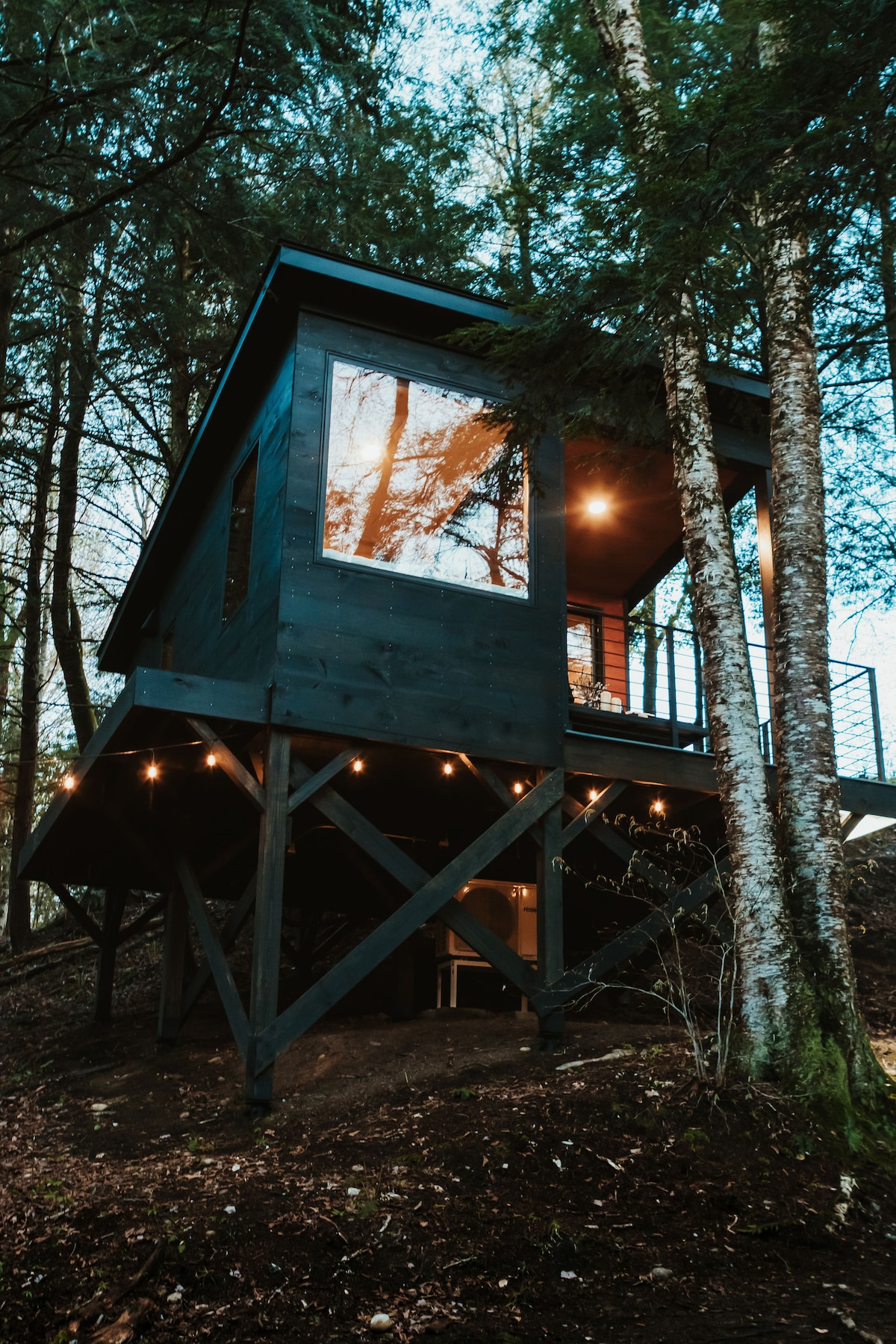 Our treehouse is a haven of well-being, peace, and elegance. In our stunning modern treehouse we have brought relaxation to a whole new level. Surrounded amongst us is nothing but woods & wildlife. An experience not to be missed. Put your favorite movie on the projector, get Zen in the cozy sun room, jam out to music on the record player, or grab a towel, and head for the custom cedar hot tub. It is time to create core memories that will never be forgotten. Welcome to a little slice of heaven.