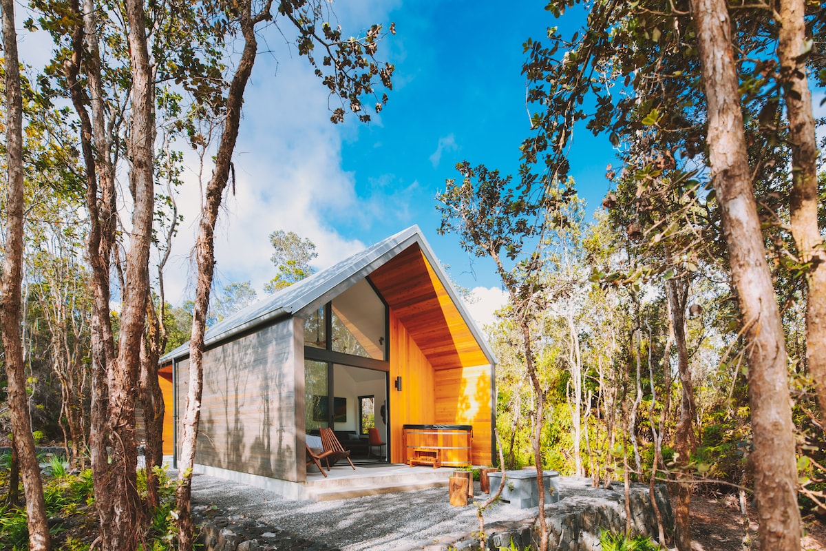 Tucked high in emerald treetops, on the forested slopes of Kīlauea Volcano, a cedar cabin outlooks the native rain forest 1.4 miles (2.2km) from Nāhuku (the lava tube) in Hawaiʻi Volcanoes National Park. This sojourn allows one a presence with the environment, to embark on adventures around the island, and be at ease afterward. Your occasional companions include moonlit mist-laden trades, the subtle glow of the Milky Way, and peaceful morning light as melodic birds dart about the lanai.