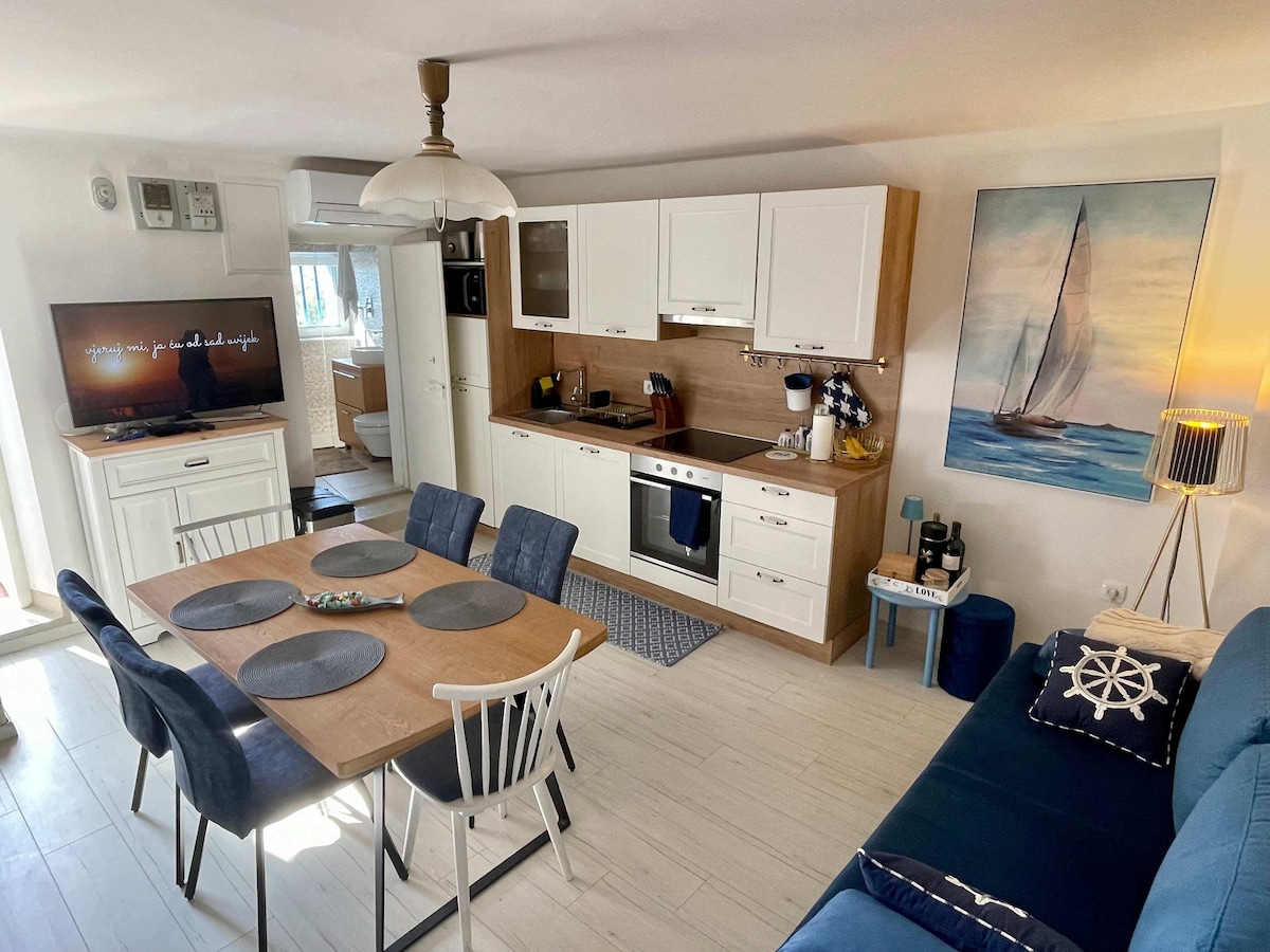 Schönes und ruhig gelegenes Apartment mitten in der Natur. Das Apartment ist 35 qm groß und bietet einen Wohnraum mit EBK, Essplatz und bequemer Schlafcouch sowie ein Schlafzimmer mit Doppelbett und Badezimmer. Ein Fuß- und Radweg führt zum ca. 2km entfernten gepflegten "Vela Placa Beach".Jedes Apartment erhält Pro Gast ein kostenloses Leihfahrrad. Das nächstegelegene Restaurant ist fußläufig zu erreichen. Ca 100m entfernt befindet sich eine öffentliche Trinkwasserquelle aus dem Baska Gebirge.