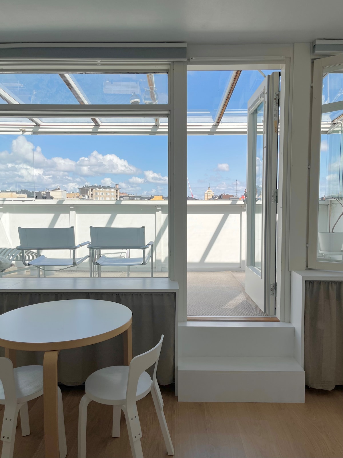 This top floor apartment overlooks downtown Helsinki. The 1939 Funkkis style building sits in a neighborhood of eateries and cafes, and within 10 min walk of the Ateneum, Amos Rex and Kiasma museums. A clever floor plan accommodates many guests. A steel and glass wall floods the apartment with light. All four bedrooms enjoys rooftop views and brand new Finnish beds to fall asleep in after a sauna. The kitchen is a perfect spot to enjoy your coffee and contemplate the very best of Helsinki.