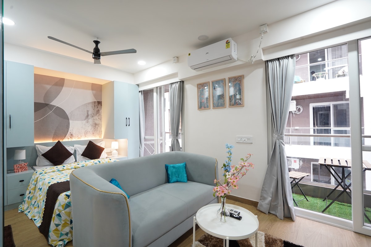 Step into 404 Luxe Haven, a thoughtfully designed 404 sq.ft studio apartment blending modern comfort, warm lighting, and elegant interiors. Featuring a signature mustard velvet sofa, a cozy queen bed framed with floral backlighting, a stylish modular kitchen, and a relaxing balcony with greenery, this space is perfect for singles, couples, or business travelers. Enjoy a peaceful ambiance with contemporary décor, soft neutral tones, and every essential curated for a seamless stay.