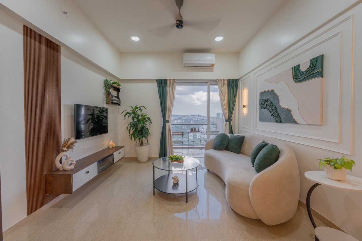 Wake up to stunning sunrise views at The Cozy Cove, a serene retreat in Pune’s Blue Ridge Township. This modern, fully-furnished apartment features a cozy sofa cum bed, a restful bedroom with soft linens, and elegant interiors designed for comfort and style. Enjoy Netflix and chill nights on the smart TV, a serene balcony setup, and a sleek modular kitchen equipped for all your needs. Perfect for couples or small families, it’s a peaceful escape with all the conveniences of home.