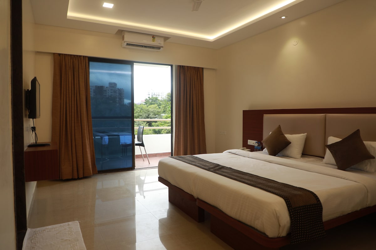 Designed for effortless business travel, the Superior Queen Room offers a clean, calm, and efficient stay. The room features a plush queen bed, work-friendly layout, thoughtful lighting, air-conditioning, and a soothing ambience for deep rest. Ideal for solo travelers, short corporate stays, and quick city stopovers in Magarpatta City.