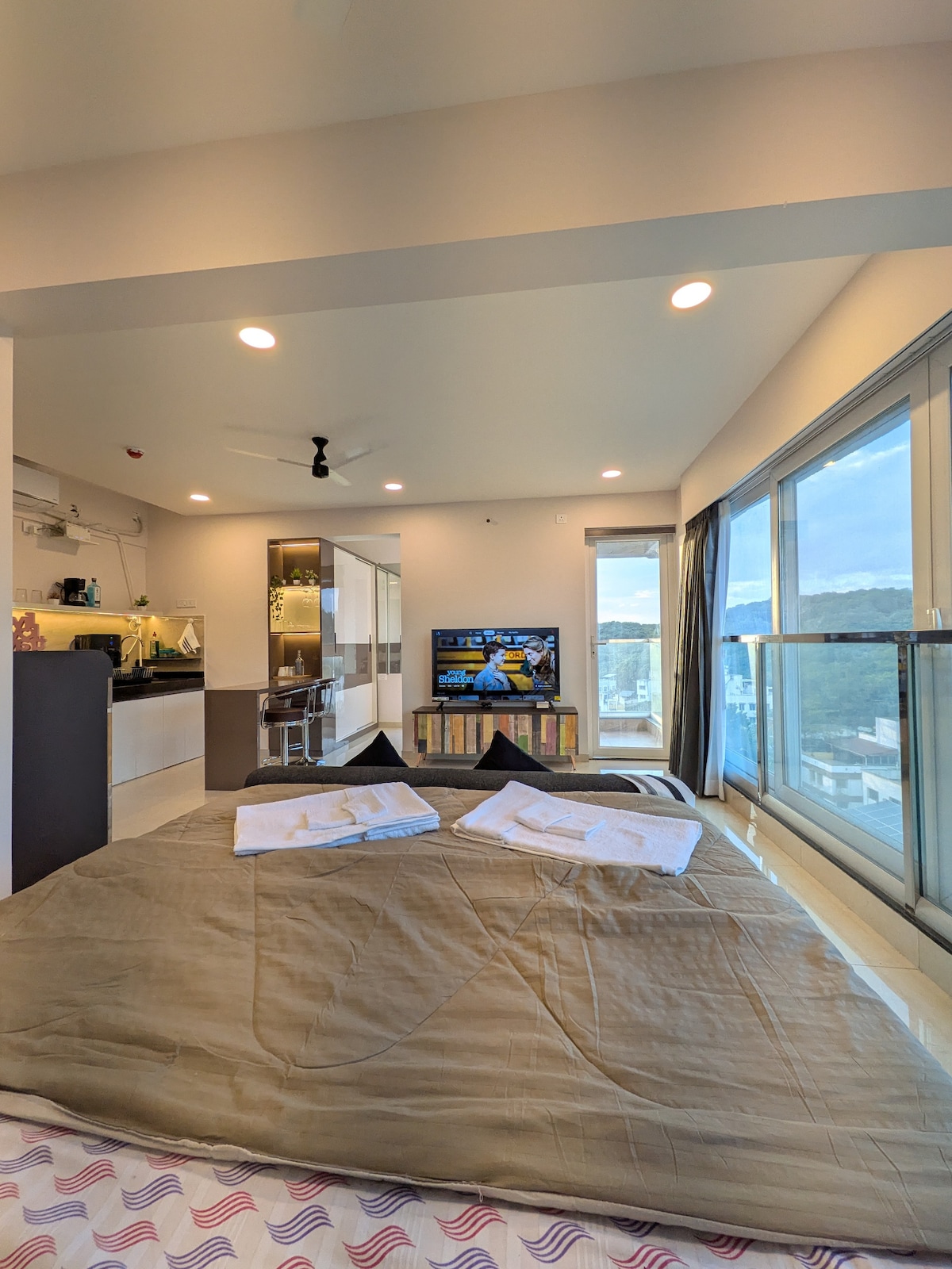 Nest ( 1BHK AC Suite) 32nd Floor splendid view of Pune City. #Living Area: Airconditioned 56incs Smart 4KHD TV Alexa ECO music 🎶 experience Books,Cards and Ludo Queen size sofa cum bed Dinning/Work Table with Chairs Broadband internet connectivity. Balcony #Kitchenette: Microwave Oven Induction Plate Hot Kettle 🔥 Toaster French Press Cookwares Crockeries Coffee Mugs Complementaries #Bedroom Room Airconditioned Queen size bed with side tables Dressing Mirror Wardrobe Balcony