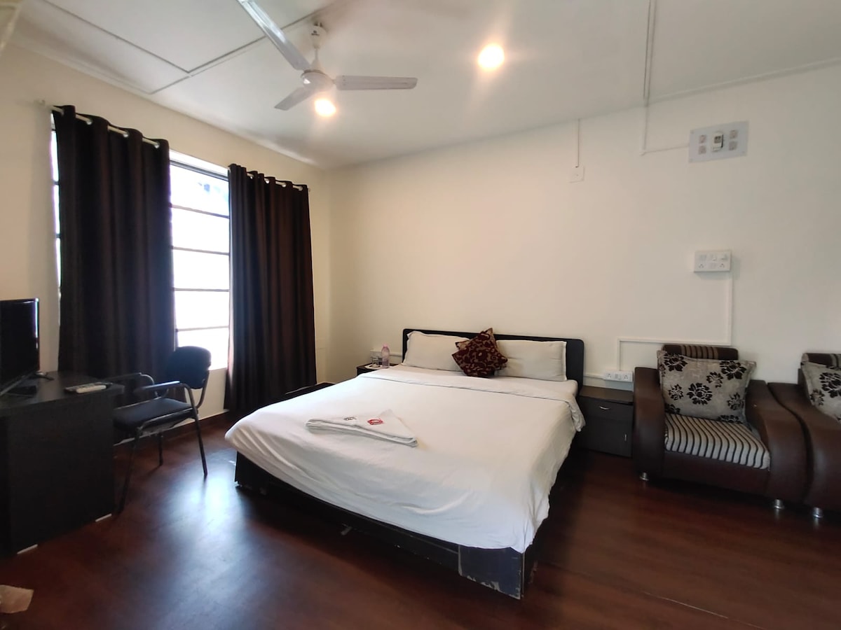 This is a spacious independent AC room with private entrance located on the 1st floor of our building. The room has an attached bathroom and balcony. The balcony has an open air sit-out space as well with the view of the garden of the neighboring building.
