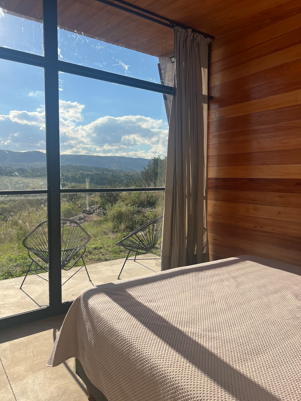 Cabaña equipada para una estadía totalmente relajante. Con hidromasaje, con ventanales para disfrutar la naturaleza, cama queen. A.A. frio calor y estufa a leña, cualquier estación es ideal para escapar a las sierras. Baño con ducha y ante baño, sillón de dos cuerpos, TV de 42'', DVD y wifi. Cava con vinos seleccionados y tostadora, juegos de mesa y libros de lectura corta. Terraza deck con asador, cochera y parque. Tenemos una piscina playa, con un hermoso entorno natural.