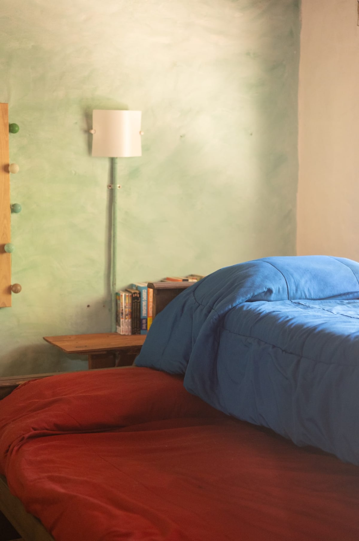 Pequeño departamento con balcón terraza ubicado en el corazon del callejon de las Rosas, San Marcos Sierras. A pocas cuadras del rio del pueblo. Se accede por escalera externa a la casa principal, cuenta con una amplia terraza balcon con vista al jardin, la acequia y nuestros numerosos frutales. El departamento tiene: pequeño living con sillon, cocina equipada, heladera, calefon, baño con ducha, ropa blanca, habitacion con una cama matrimonial, una cama individual, placares, ropa de cama.