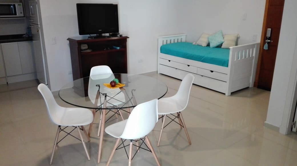 Dpto nuevo en Villa Carlos Paz, a 50 metros del Lago. Cuenta con pileta con vista al lago, asadores y cochera. Seguridad privada las 24 hs, a 5 minutos del Centro y a 15 cuadras de la terminal. El dpto cuenta con cama Queen y 1 sofá cama doble/ 2 Smart TV con cable/ Wifi/AA/Heladera/Microondas/Horno y anafe eléctricos/Extractor/Pava eléctrica/Tostadora/Vajilla completa/Ropa de cama y baño/Reposeras/Ascensores/portón automático