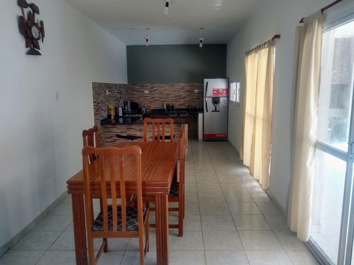 Living integrado a la cocina con futon que se hace cama de 2 plazas, mesa para 5 personas, tv led de 32 pulgadas, ventilador de techo, microonda, heladera con freezer, cocina a gas, pava eléctrica, calefactor para invierno a gas, baño en planta baja y otro en planta alta. Planta alta con 2 habitaciones individuales una con cama doble - aire acondicionado split - ventilador de techo y tv; la otra con cucheta doble y ventilador de techo. Garage cubierto abierto, asador.