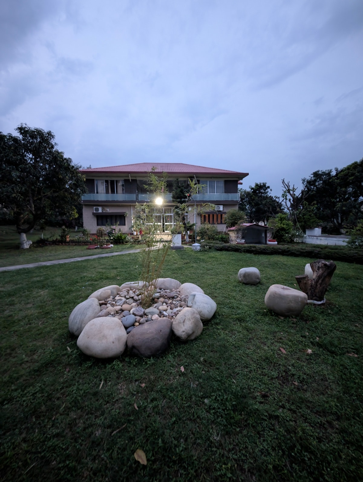 Set within beautiful landscaped garden the property features a spacious, elegant home overlooking a peaceful lawn The highlight of the space is the thoughtfully designed outdoor seating area natural stone seating arranged around a central feature perfect for morning chai evening conversations, or simply soaking in the calm. Step outside and you’ll find a rustic outhouse, adding a unique, earthy charm to your stay great for quiet moments, creative work, or just enjoying the slow pace of hill life