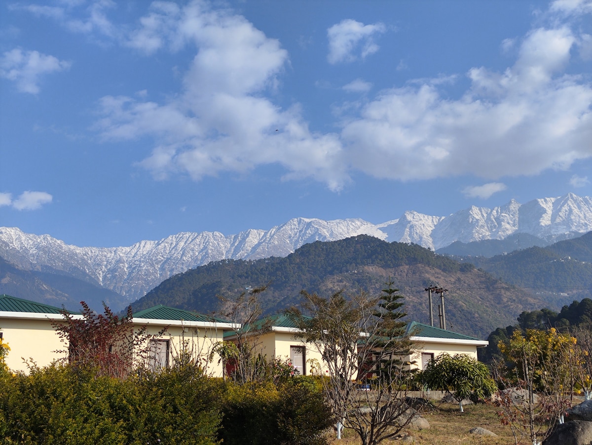 Our hut-style cottages set against the beautiful Dhaladhar ranges will give you the luxury and comfort of having your own little nest of solace amidst beautiful lush-greenery and blossoming trees. We have 4 cottages on the property, each with the below-listed features/amenities: *King-size bed *Private porch & garden *Spacious bathroom with bathtub *Kitchenette with a hot plate, microwave & minibar *Dining area *Air-conditioning *Flat-screen TV *Room service *Complimentary Wi-Fi