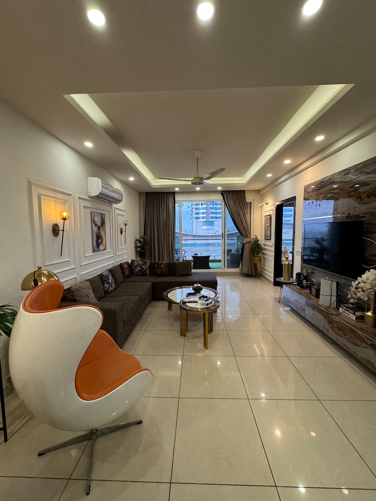 Our 1 BHK Orbit Penthouse in DHA Phase 5 is where urban chic meets celestial cool. Think: a glowing moon wall for those late-night selfies and a bold dollar-stacked art piece that screams "main character energy" Wake up to park views from your private balcony swing, binge your faves on the 50" 4K Smart TV, or cook up something aesthetic in the fully loaded designer kitchen. The interiors? Abstract, stylish, and made for the feed. Plus, you're right next to Lahore's hottest dining spots.