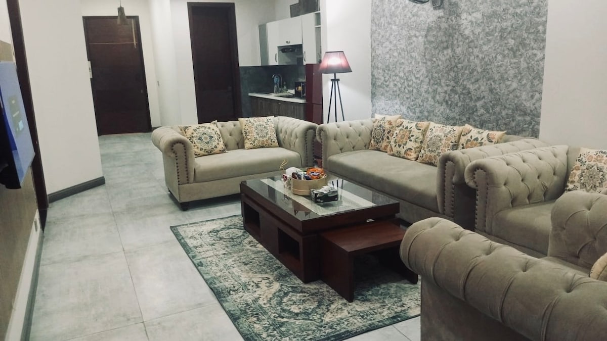 Welcome to @blueoakresidences Spacious 1500 Sq ft apartment in F-11/1 Islamabad with 2 ensuite bedrooms each with a private balcony, Powder room, UPS backup, Fast WiFi, Self check-in, and a 58" smart TV. Kitchen, hot water, free parking, 24/7 elevator included. For groups larger than 4, 2 extra floor mattresses are provided for up to 6 guests. Bassinet available on request for 3+ nights (PKR 5000). Steps from Loafology, Nando's, Asian Wok, KFC, Al-Fatah. Family-friendly park right outside.