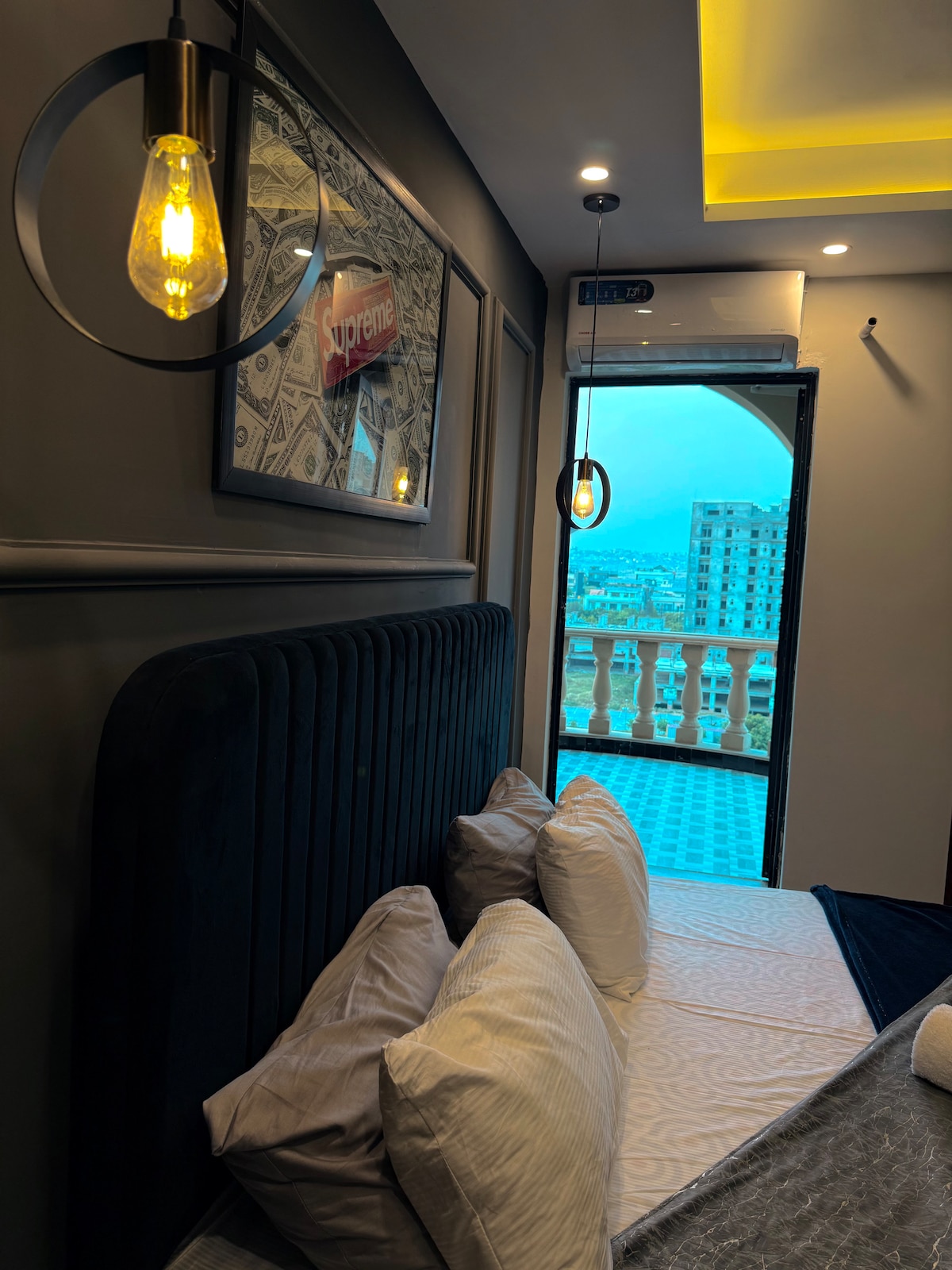 Our 1 BHK Orbit Penthouse in DHA Phase 5 is where urban chic meets celestial cool. Think: a glowing moon wall for those late-night selfies and a bold dollar-stacked art piece that screams "main character energy" Wake up to park views from your private balcony swing, binge your faves on the 50" 4K Smart TV, or cook up something aesthetic in the fully loaded designer kitchen. The interiors? Abstract, stylish, and made for the feed. Plus, you're right next to Lahore's hottest dining spots.