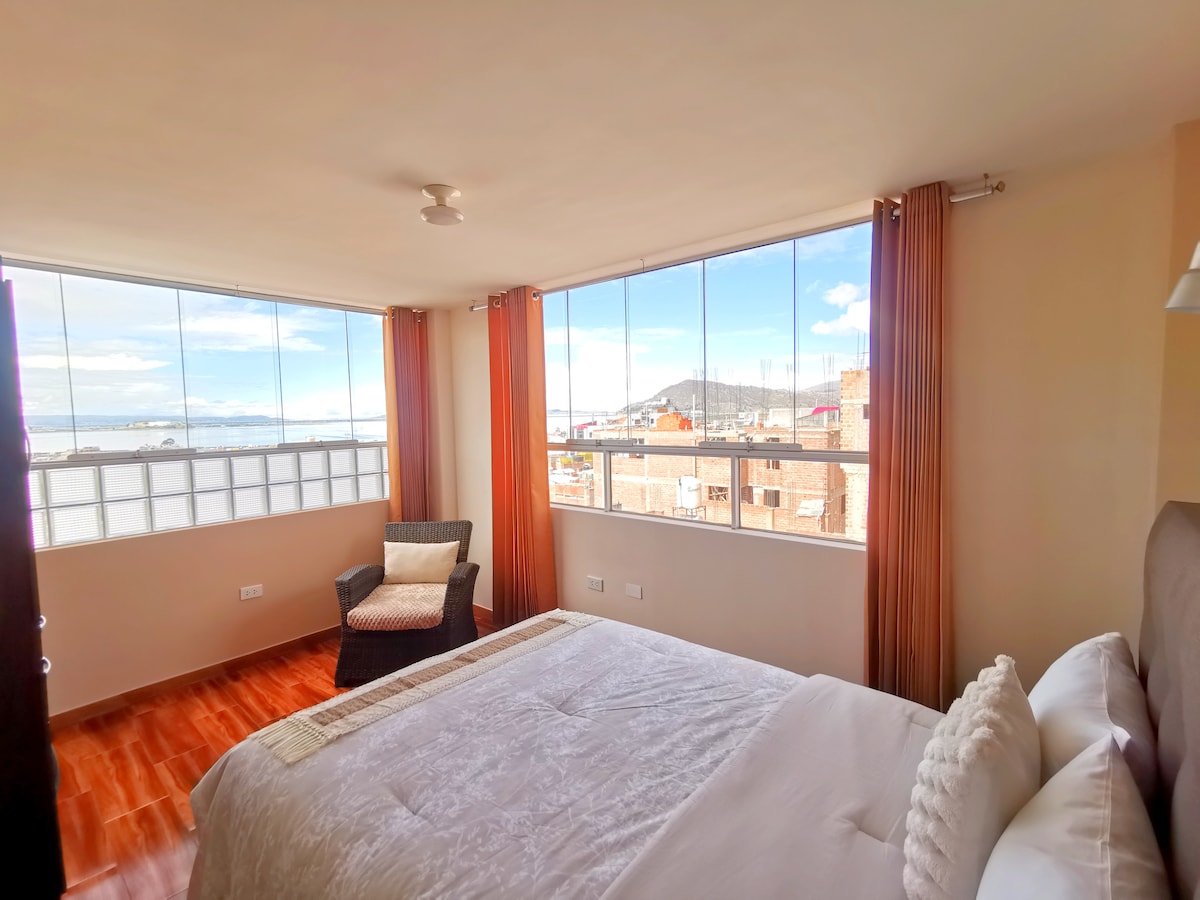 ¡La vista te impresionará y disfrutarás de un ambiente privado y luminoso! ❇️ Sala de estar con smart TV ❇️ Estación de té con hervidora, termo, microondas y vajilla. ❇️ 1 cama matrimonial ❇️ Ducha independiente y privada. ❇️ Baño independiente y privado. ❇️ Garaje privado (con pago adicional) La zona es segura y podrás visitar un mercado tradicional, ¡ven y sumérgete en la cultura de Puno!