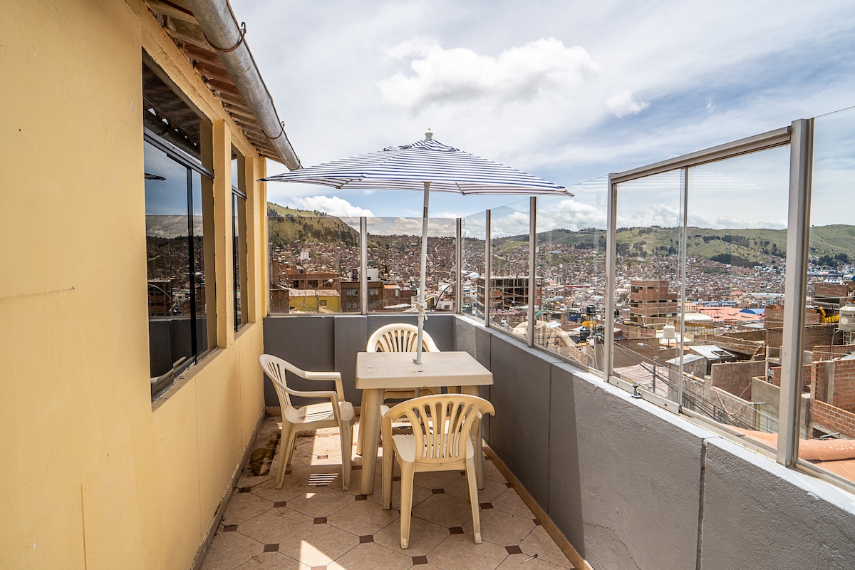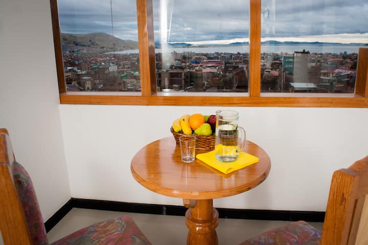 We are located in a safe area 4 minutes away to downtown of Puno (by taxi), with an extraordinary view of the city and the sacred lake of the Incas. All rooms have fine finishes and are made for all types of travelers. The terrace has an amazing view of the highlands, join city, sky and lake in a single image. Ideal for nature lovers. you'll feel in home away from home. Our experience in tourism will make your stay unforgettable.