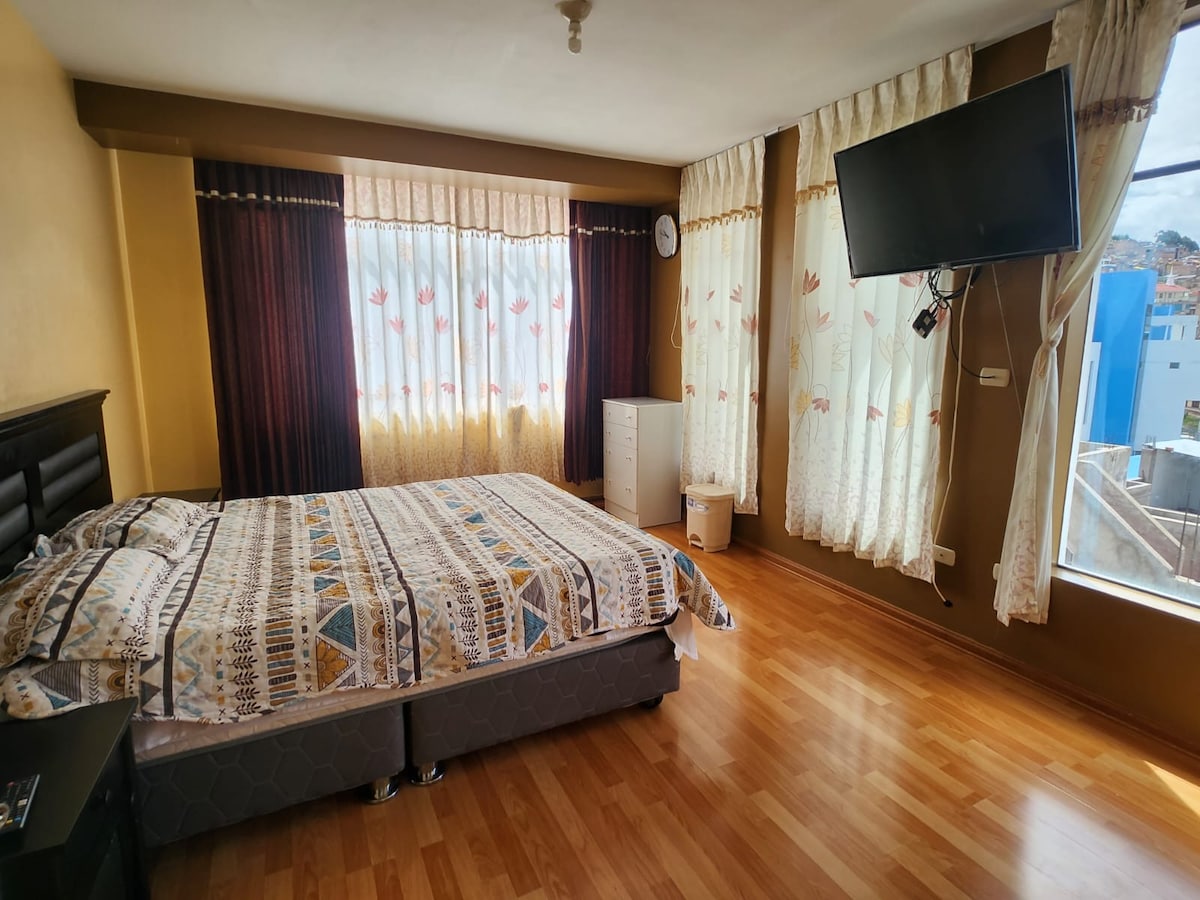 ¡La vista te impresionará y disfrutarás de un ambiente privado y luminoso! ❇️ Sala de estar con smart TV ❇️ Estación de té con hervidora, termo, microondas y vajilla. ❇️ 1 cama matrimonial ❇️ Ducha independiente y privada. ❇️ Baño independiente y privado. ❇️ Garaje privado (con pago adicional) La zona es segura y podrás visitar un mercado tradicional, ¡ven y sumérgete en la cultura de Puno!