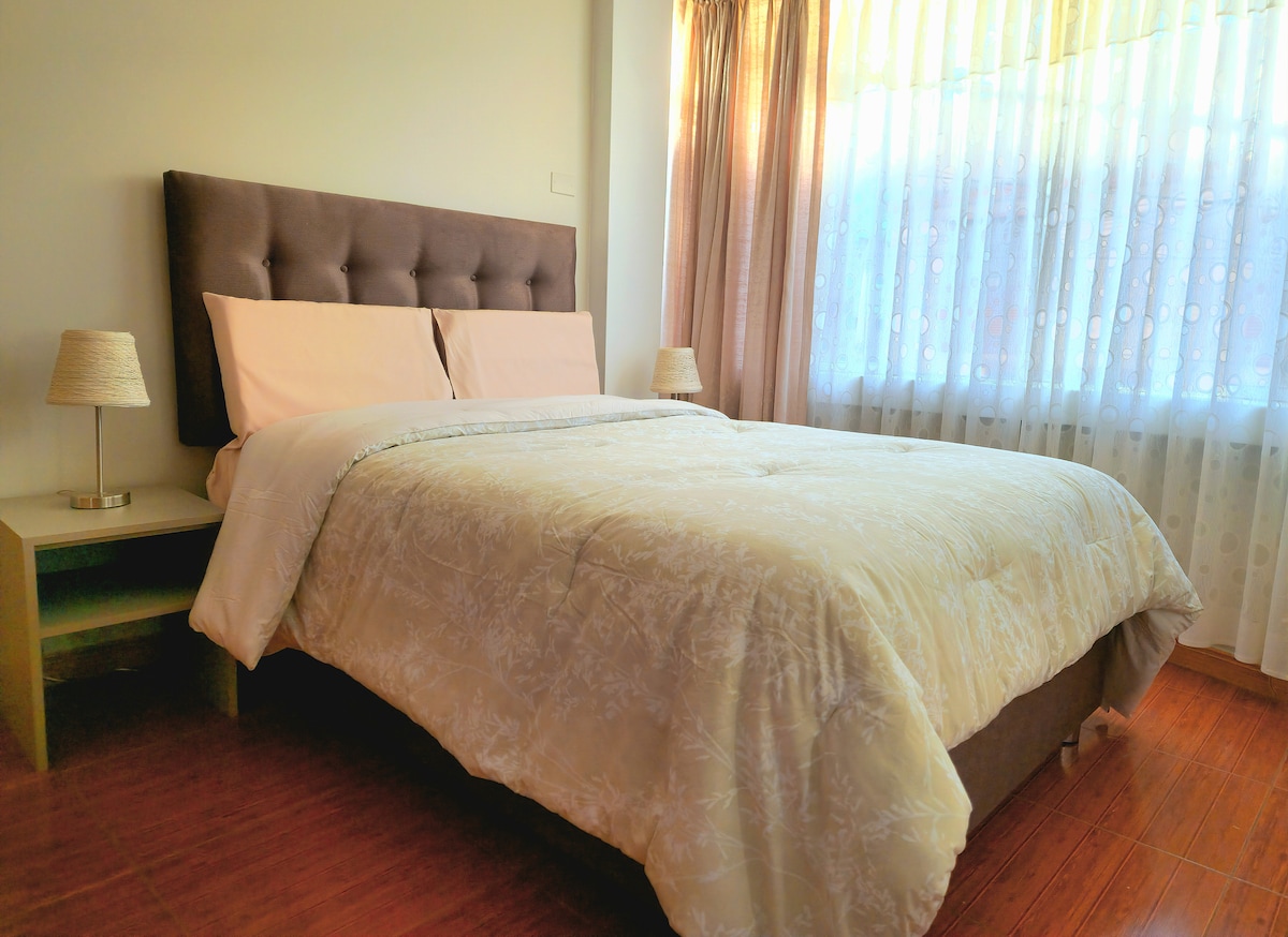 Nos ubicamos a cuatro cuadras del centro de la ciudad. Nuestras habitaciones son con baño privado, cogedoras y muy tranquilas. Te ofresco una estadía familiar. El desayuno está incluído, desde 6.30 AM hasta 9 AM, tiene vista hacia el jardin