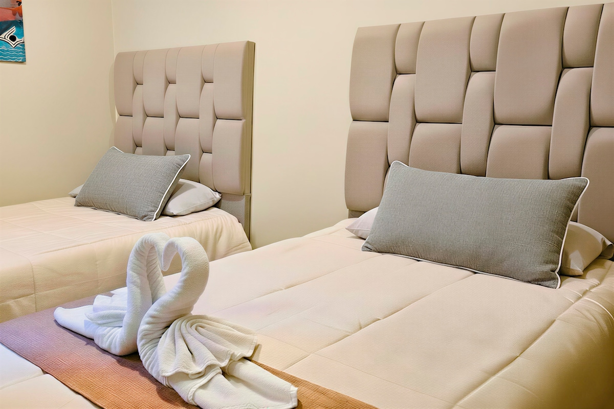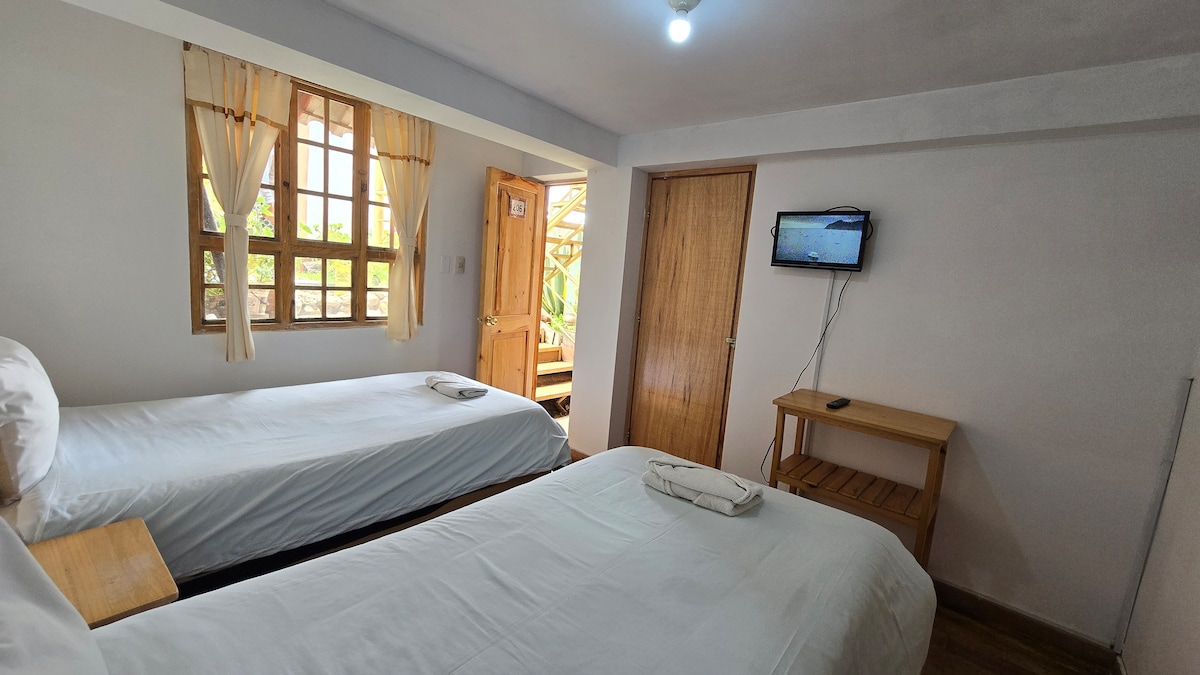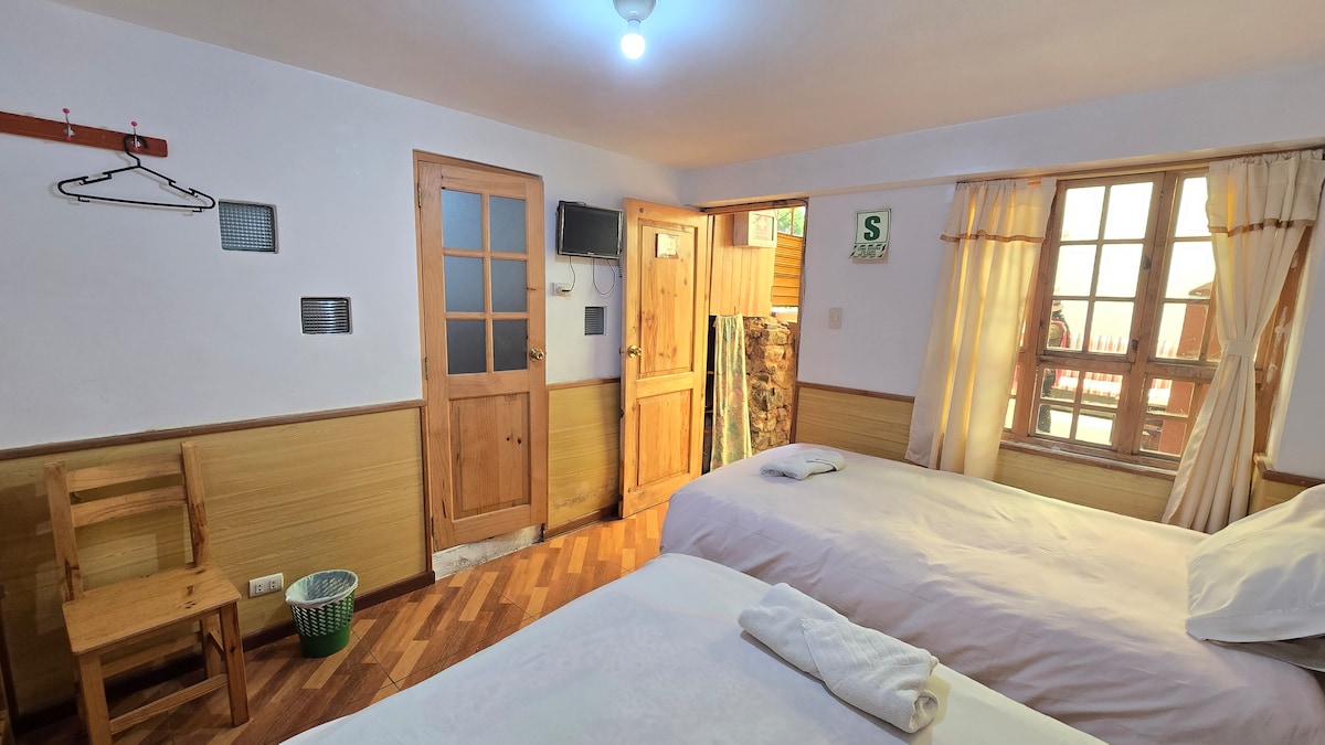 Habitación doble con dos camas de plaza y media, baño privado, WI-FI en todo el edificio, TV Smart con YouTube conexión a internet