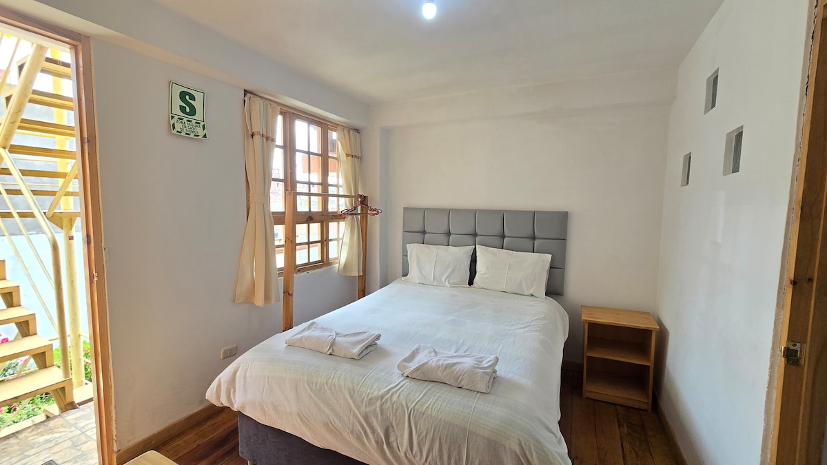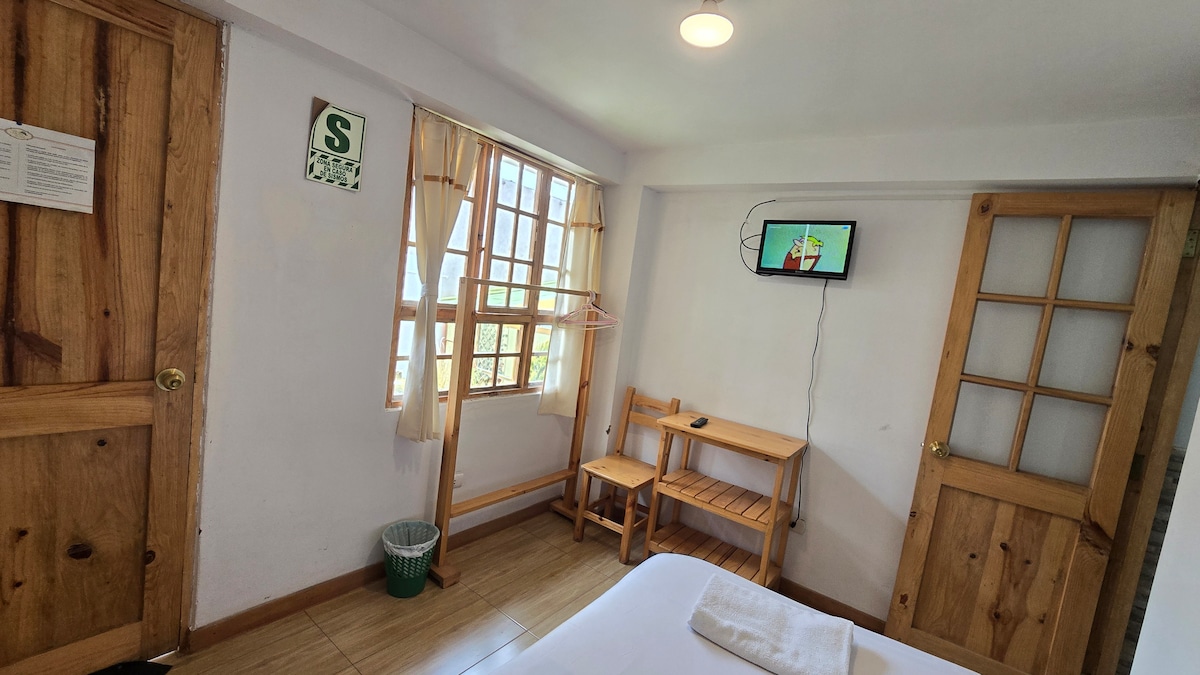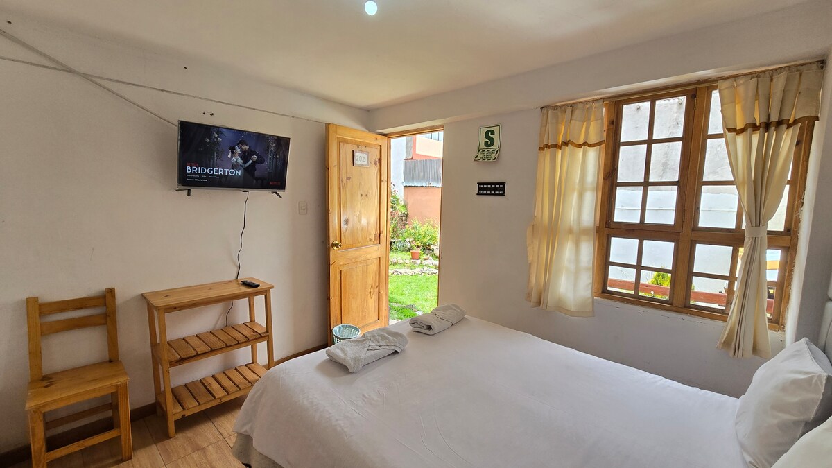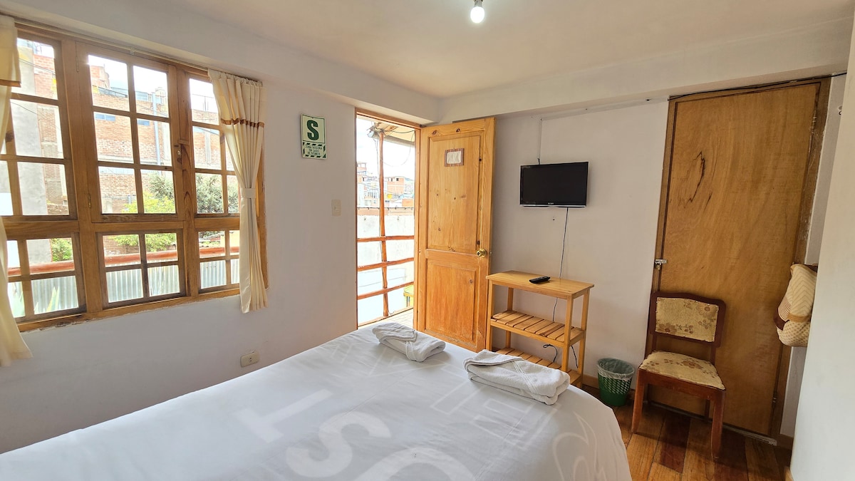 Disfruta de una habitación privada y cómoda, ideal para una o dos personas, ubicada a pocos pasos de la Plaza Mayor de Puno. Perfecta para viajeros que buscan una estadía céntrica, segura y funcional. Cuenta con WiFi, uso de cocina compartida equipada, sala común y terraza compartida. Ingreso autónomo y seguro mediante caja de guarda llaves. Baño compartido: lavatorio en el primer piso y ducha caliente en el segundo piso.