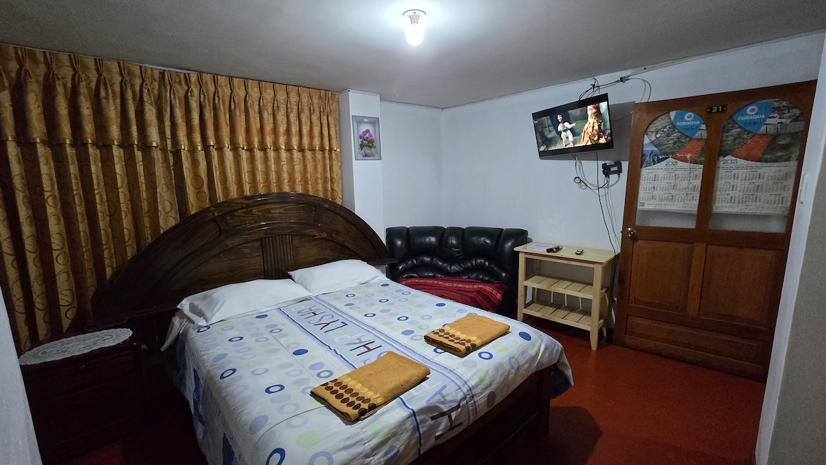 Si estas de viaje con un amigo (a) y necesitan compartir habitación pero cada uno en su cama, además buscas amplios espacios, fuera del ruido y con una vista espectacular de la ciudad, con el desayuno incluido y cochera, pues este es tu espacio ideal, a 6 minutos en taxi del centro de la plaza de armas de Puno. Siéntete como en casa y conoce gente viajera.