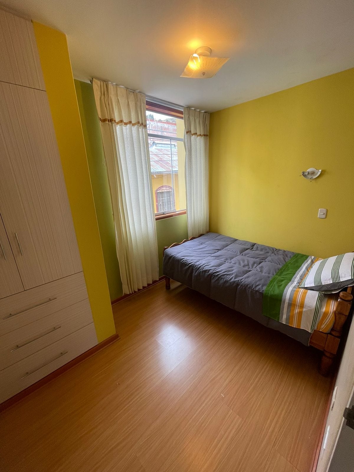 Acogedor y amplio departamento en zona tranquila de Puno, rodeado de áreas verdes y a solo 7 min del centro. Capacidad para 5 personas, con 2 dormitorios, cocina equipada, sala con sofá cama, comedor, baño con agua caliente, patio techado, parrilla, chimenea, wifi, cable, y cochera para 4 autos. Ideal para descansar, hacer yoga o desconectarse sin salir de la ciudad.