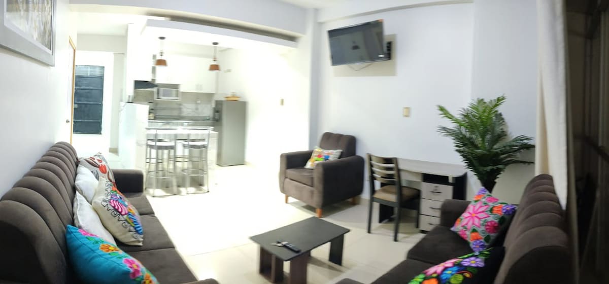 Moderno departamento en estreno a pocos metros de la plaza de armas, equipado completamente con todo lo necesario para que tengas una cómoda estadía en Puno. El departamento está ubicado en un 2do piso ubicado en el centro de la ciudad, zona segura a 2 minutos caminando de la plaza principal y de la calle principal de la ciudad, donde se encuentran los restaurantes y bares de la ciudad. El departamento tiene una cocina completamente equipada y cómodas camas, además de una amplia sala.
