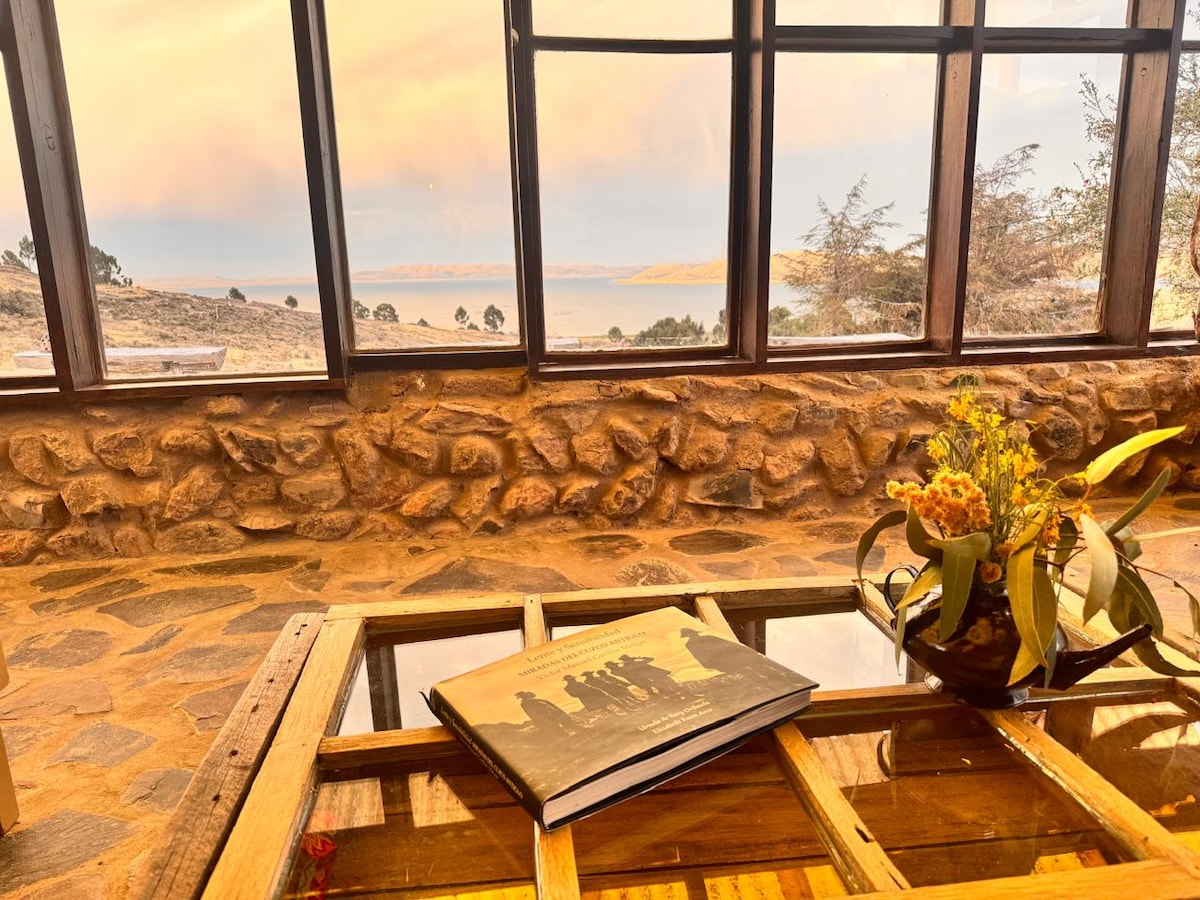 Discover your home facing Lake Titicaca: 15 hectares of freedom, roaming horses, an organic garden, and a sun-drenched yoga room. Wander the trails, feel nature at your own pace, or cook your meals while the lake and mountains surround you. A rustic yet comfortable space where time slows down — perfect for those seeking disconnection and unforgettable memories.