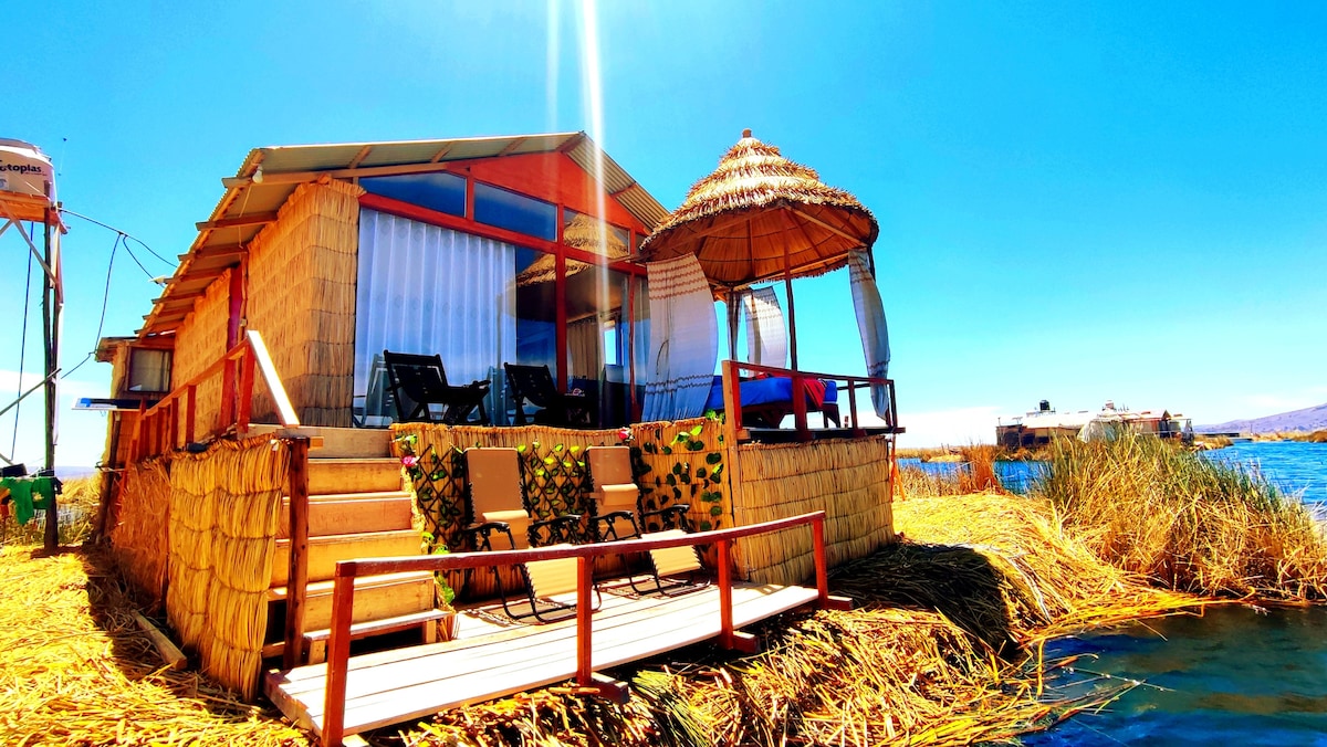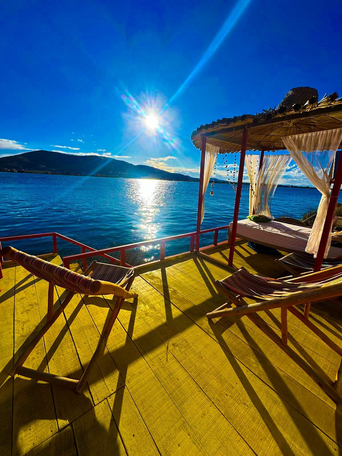 Vive una experiencia única en una isla flotante sobre el Lago Titicaca. Disfruta de amaneceres dorados, cielos infinitos y noches de calma total. Ofrecemos desayuno incluido, traslado en bote y tours opcionales: kayak, Isla Taquile y recorrido por la comunidad Uro. Dos habitaciones con vista al sol: una al amanecer y otra al atardecer. Descansa sobre el agua, en paz con el lago.