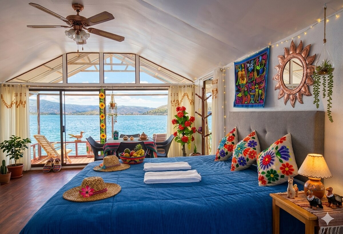 Vive una experiencia única en una isla flotante sobre el Lago Titicaca. Disfruta de amaneceres dorados, cielos infinitos y noches de calma total. Ofrecemos desayuno incluido, traslado en bote y tours opcionales: kayak, Isla Taquile y recorrido por la comunidad Uro. Dos habitaciones con vista al sol: una al amanecer y otra al atardecer. Descansa sobre el agua, en paz con el lago.