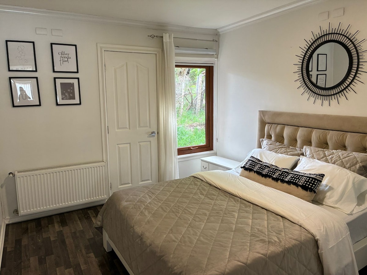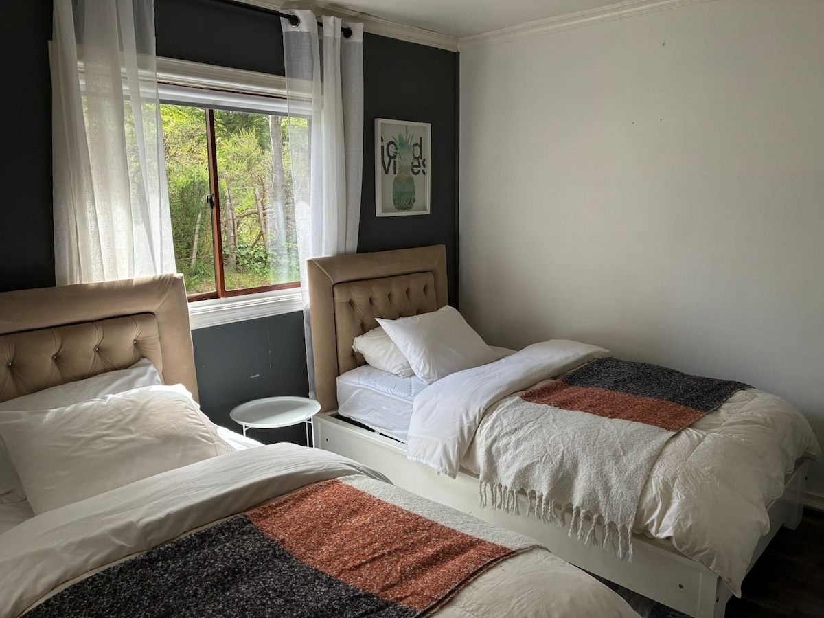 La cabaña esta pensada en una cómoda estadía familiar, tiene todo lo necesario para sentirte en tu hogar, incluso con niños pequeños. La vista da a nuestro jardín . Cerca hay panaderías, supermercados, almacenes y transporte publico.